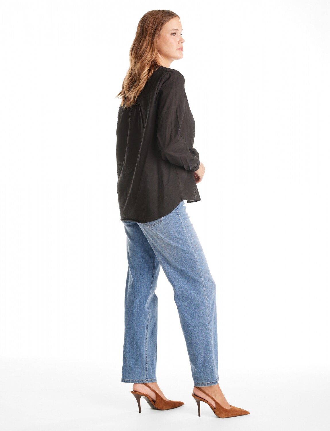 La silueta es fluida y relajada, con un canesú trasero que genera una caída impecable.