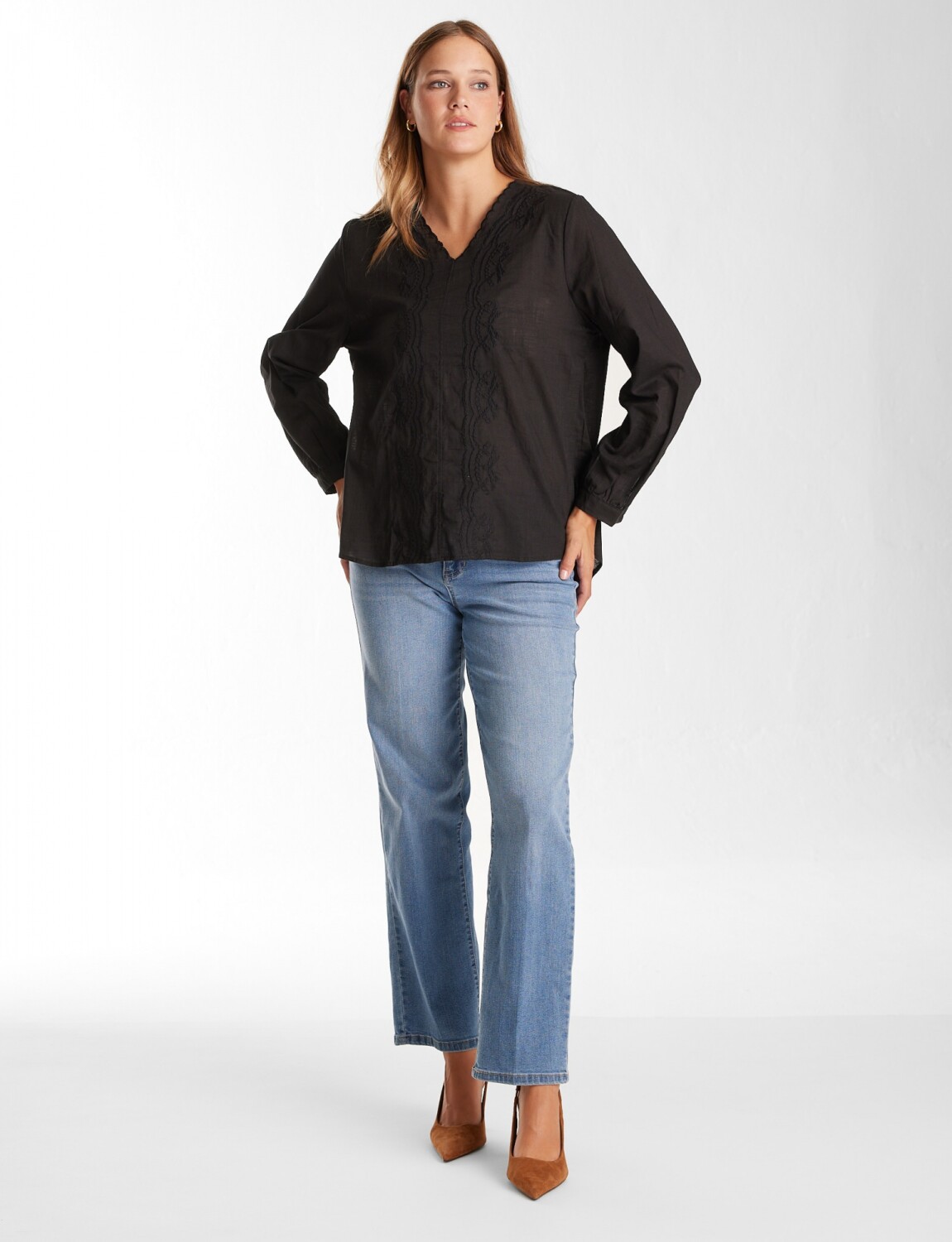 Mangas largas sutilmente abullonadas que finalizan en puños con pequeños frunces.