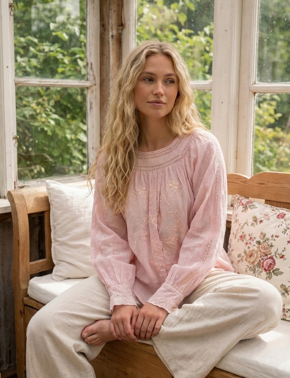 Detalle en broderie en delantera y mangas.