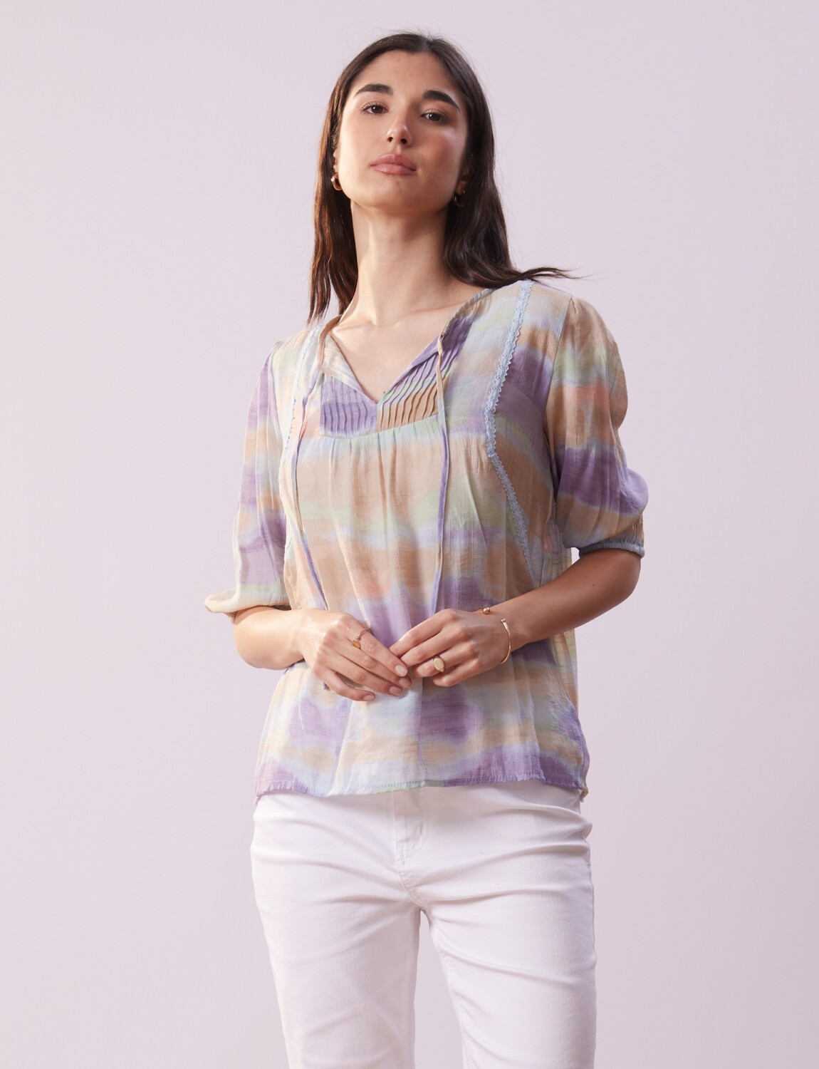 Cuello a la base, escote en V plisado y lazo de ajuste.