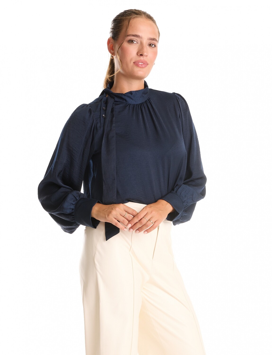Cuello alto con botones en lateral derecho y lazo para anudar.