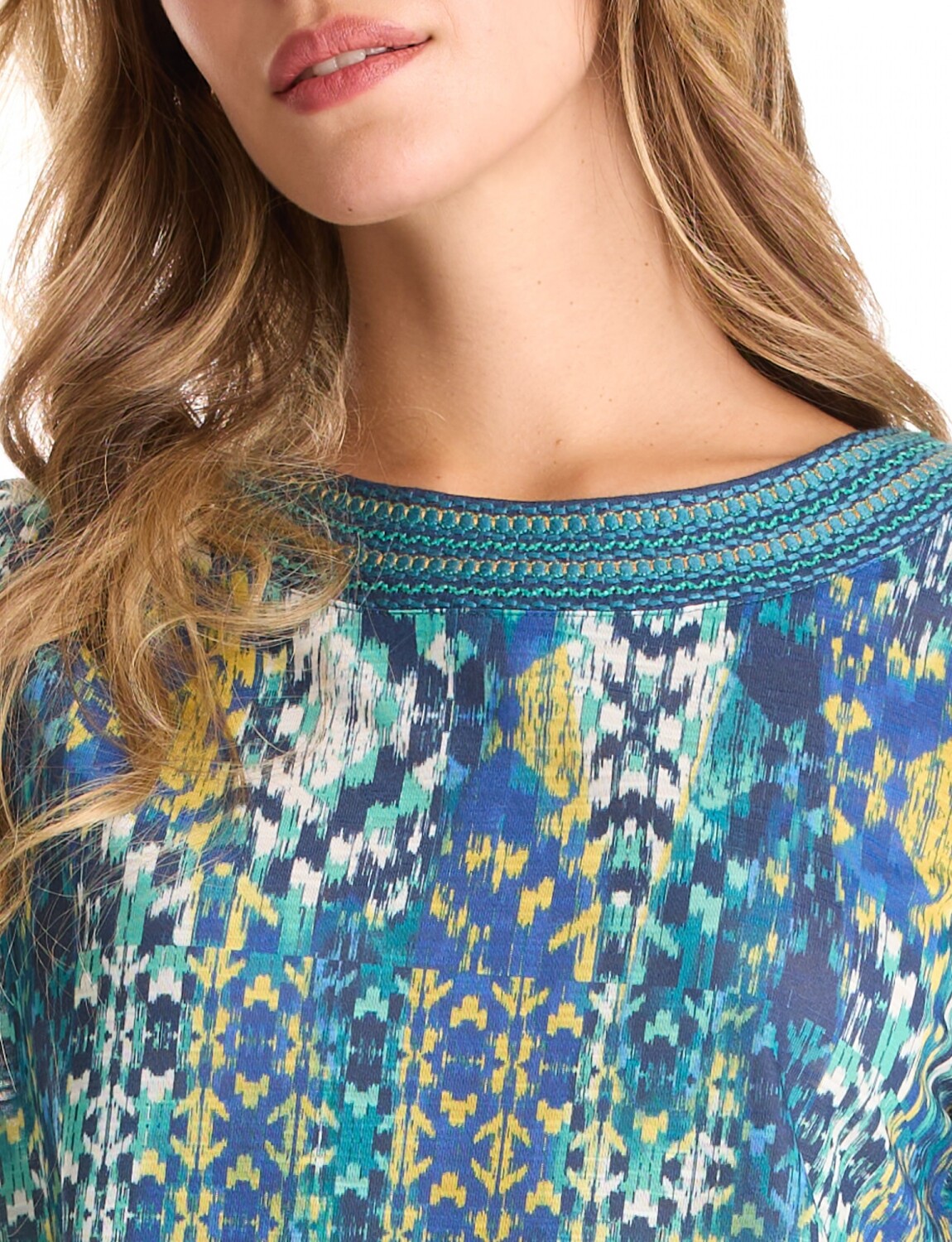 Escote redondo con detalle tejido en el contorno.