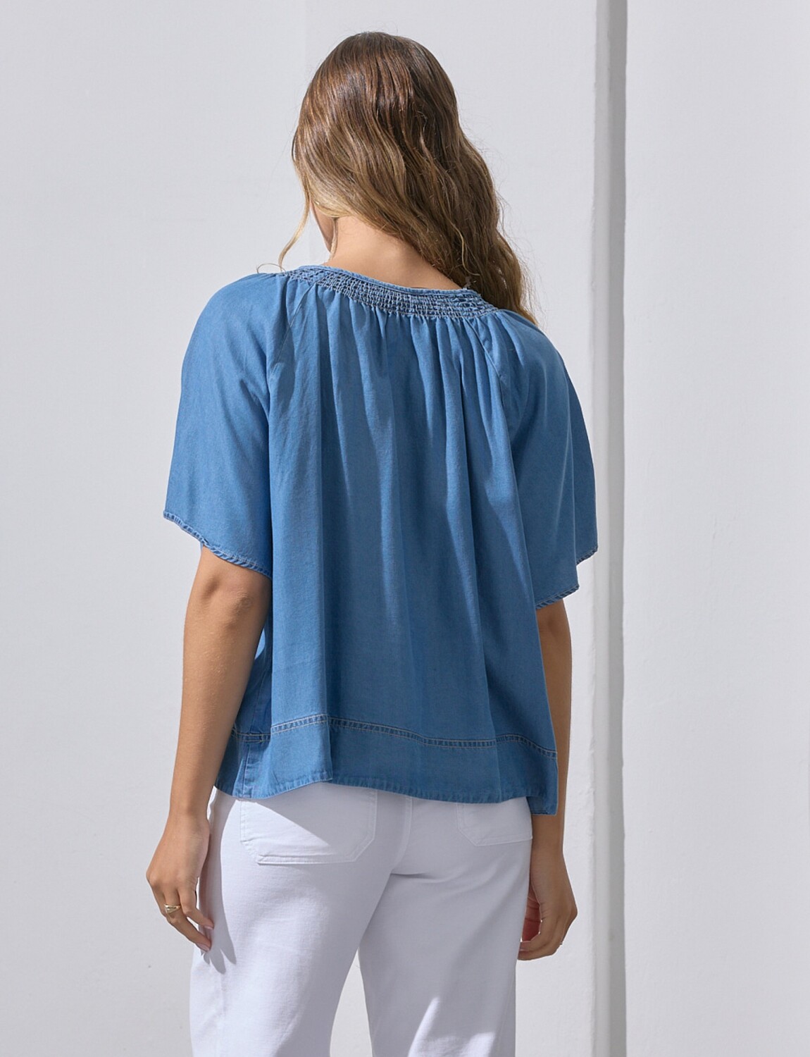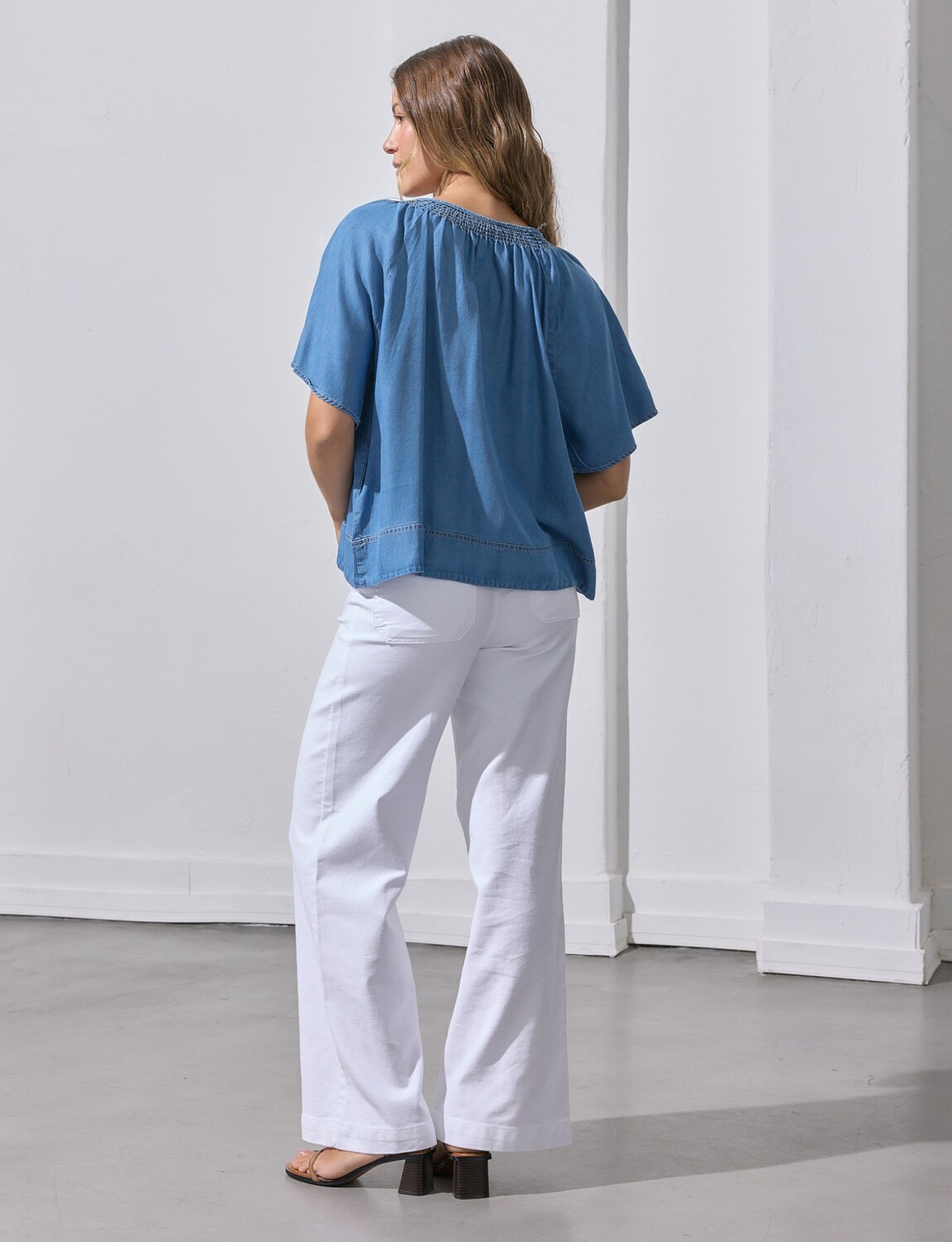 Cuello redondo en punto smock, escote en V y lazo de ajuste.