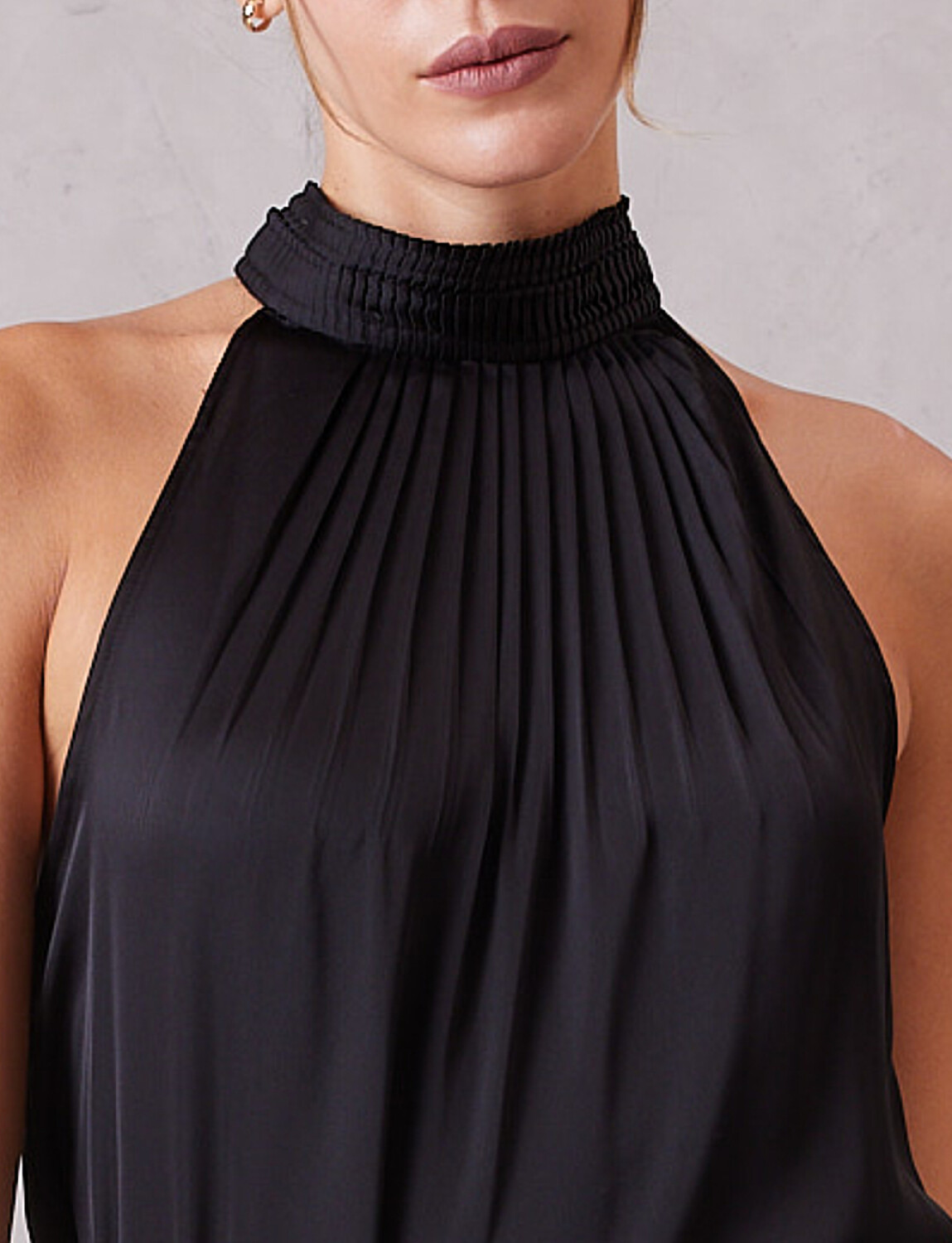 Blusa halter plisada, marca Carmen Marc Valvo.