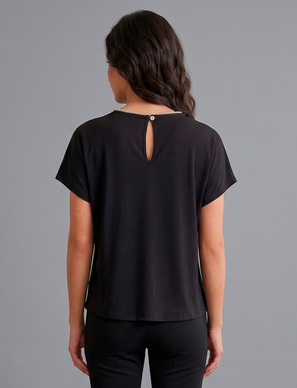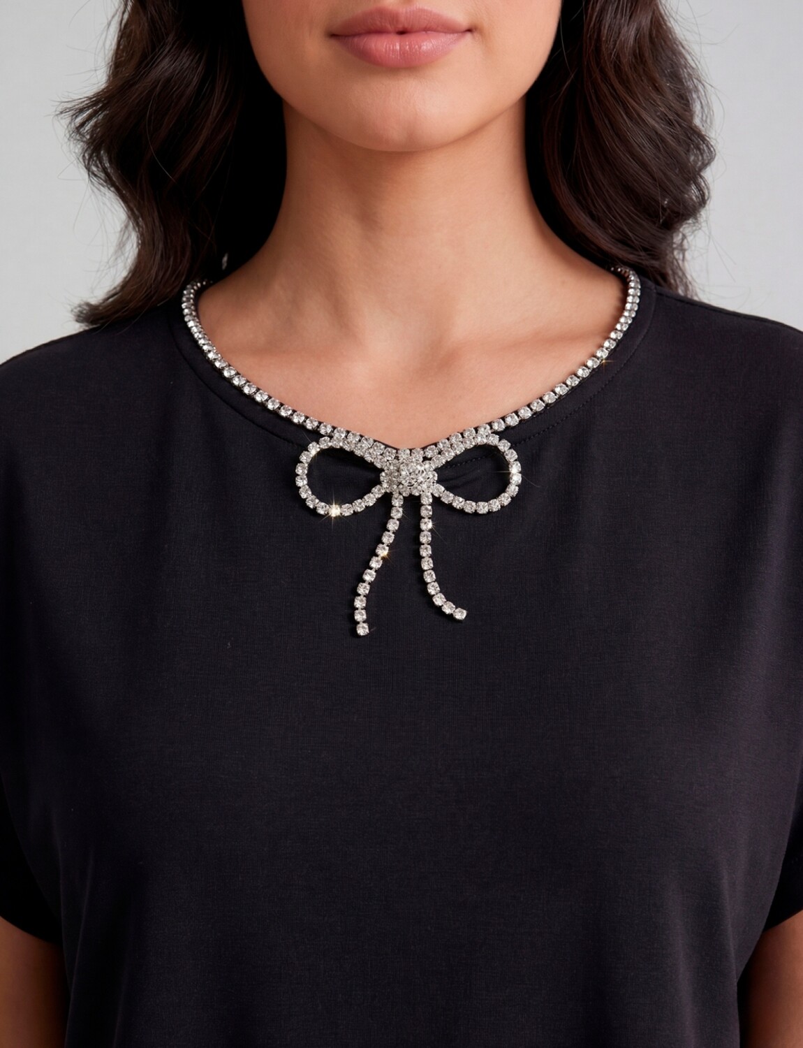 Escote redondo con aplique de strass en el contorno y broche desmontable en forma de moña.