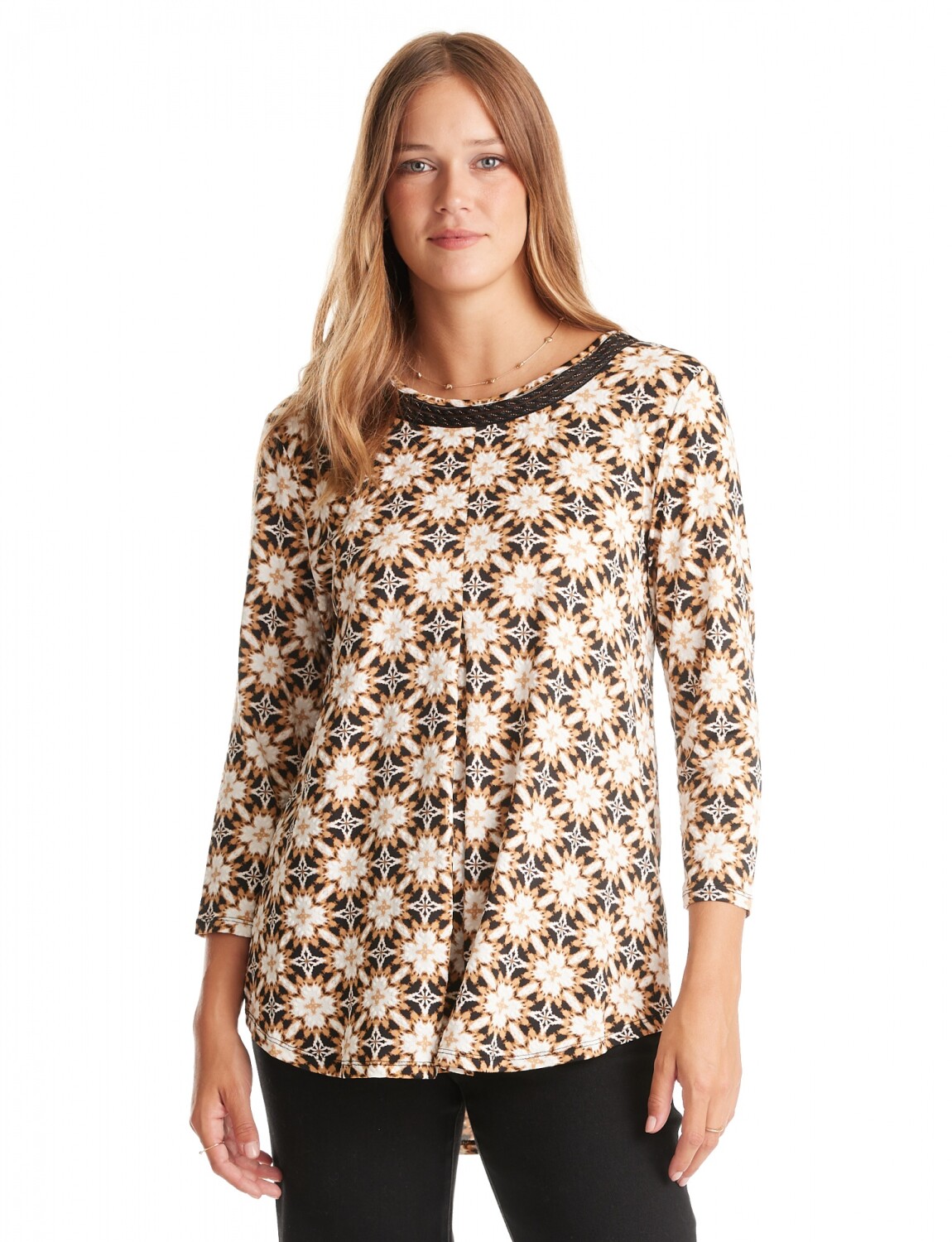 Escote redondo con trasparencia y apliques de cordón con detalles dorados.