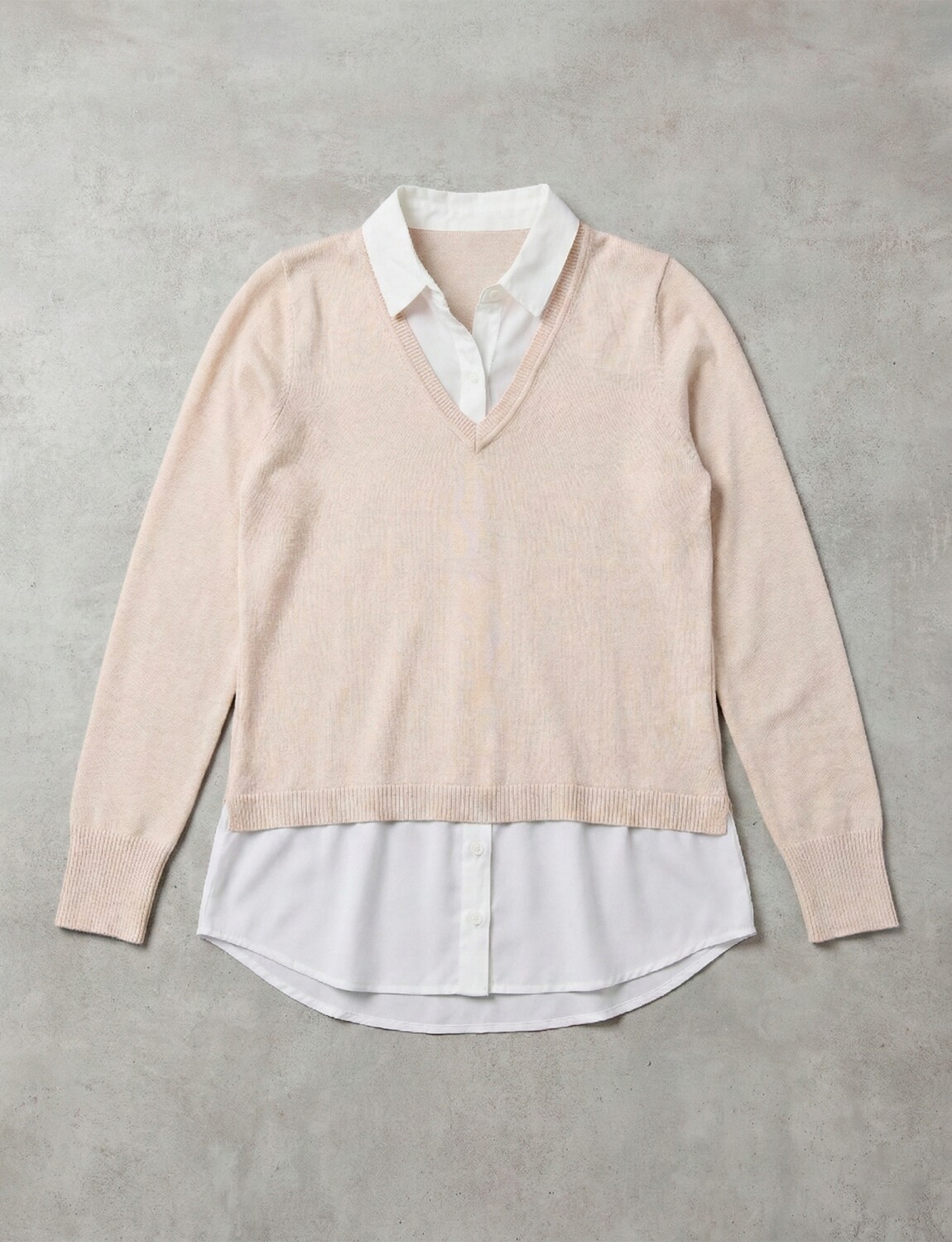 Torso en tejido de hilado fino, cuello y ruedo en gasa simulando camisa.