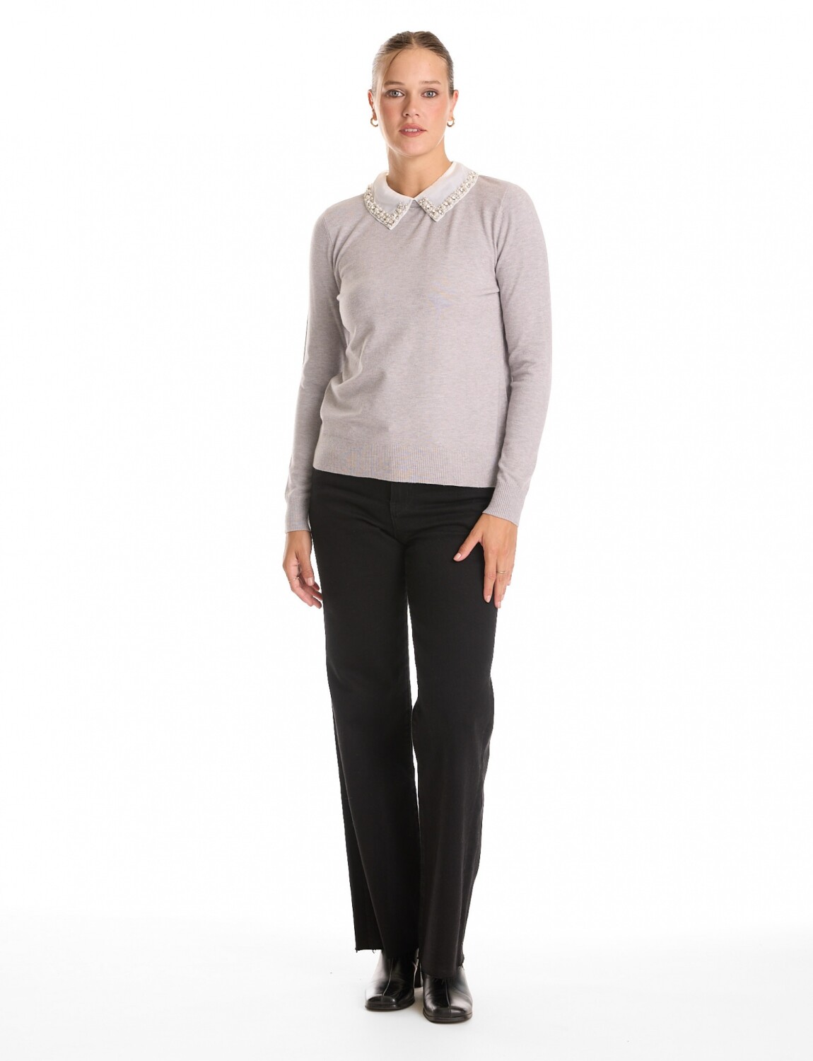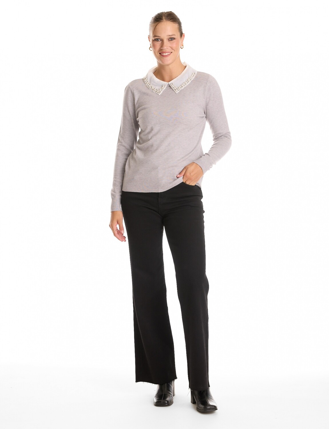 Cuello a la base, con solapa en gasa y aplique de brillos.