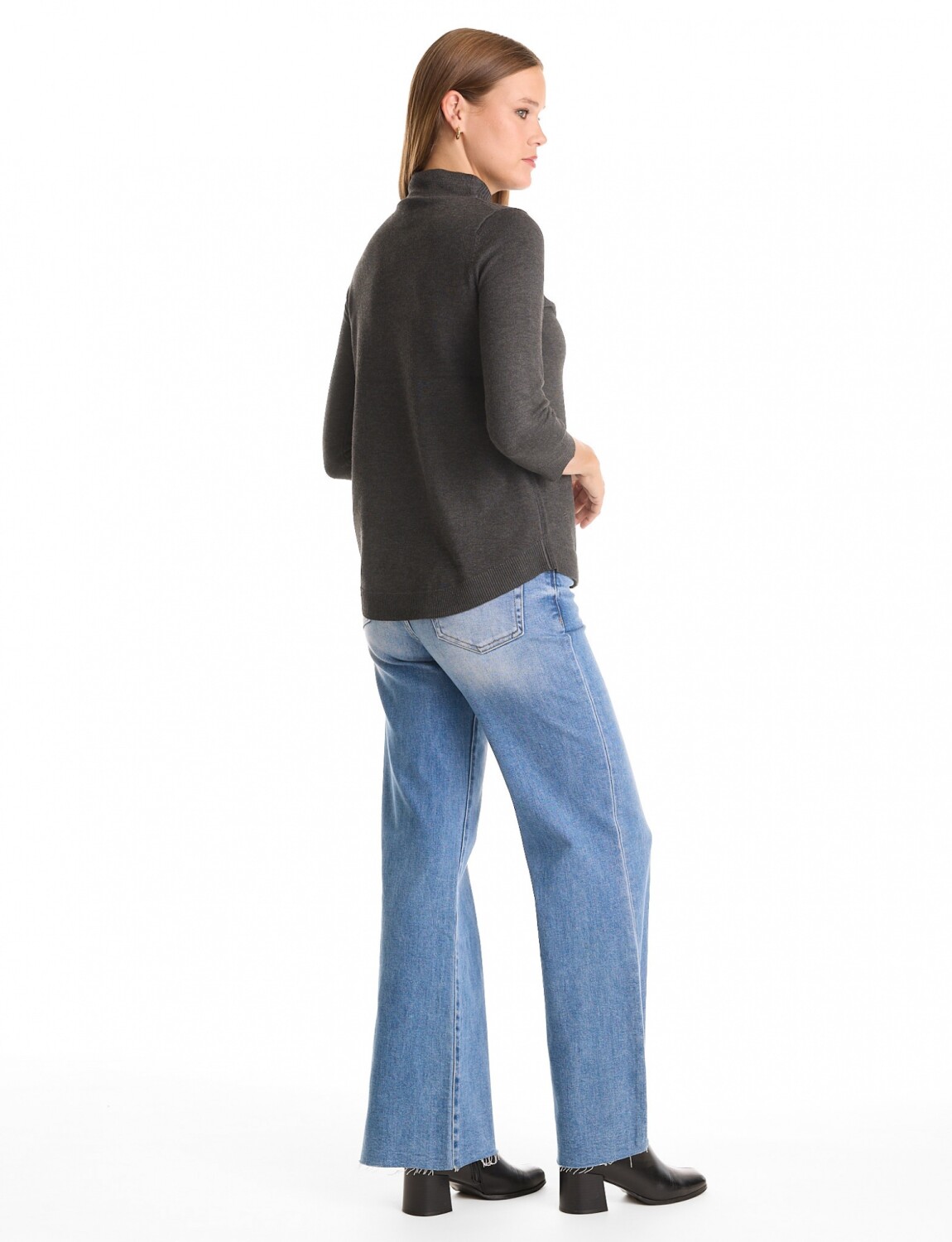 Presenta un cuello alto de rib acanalado que aporta estructura.