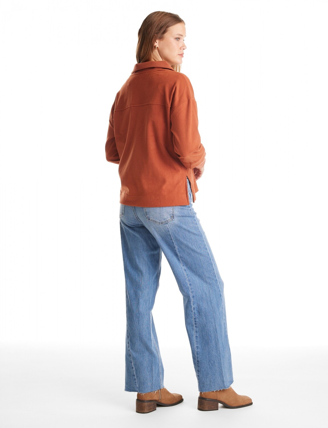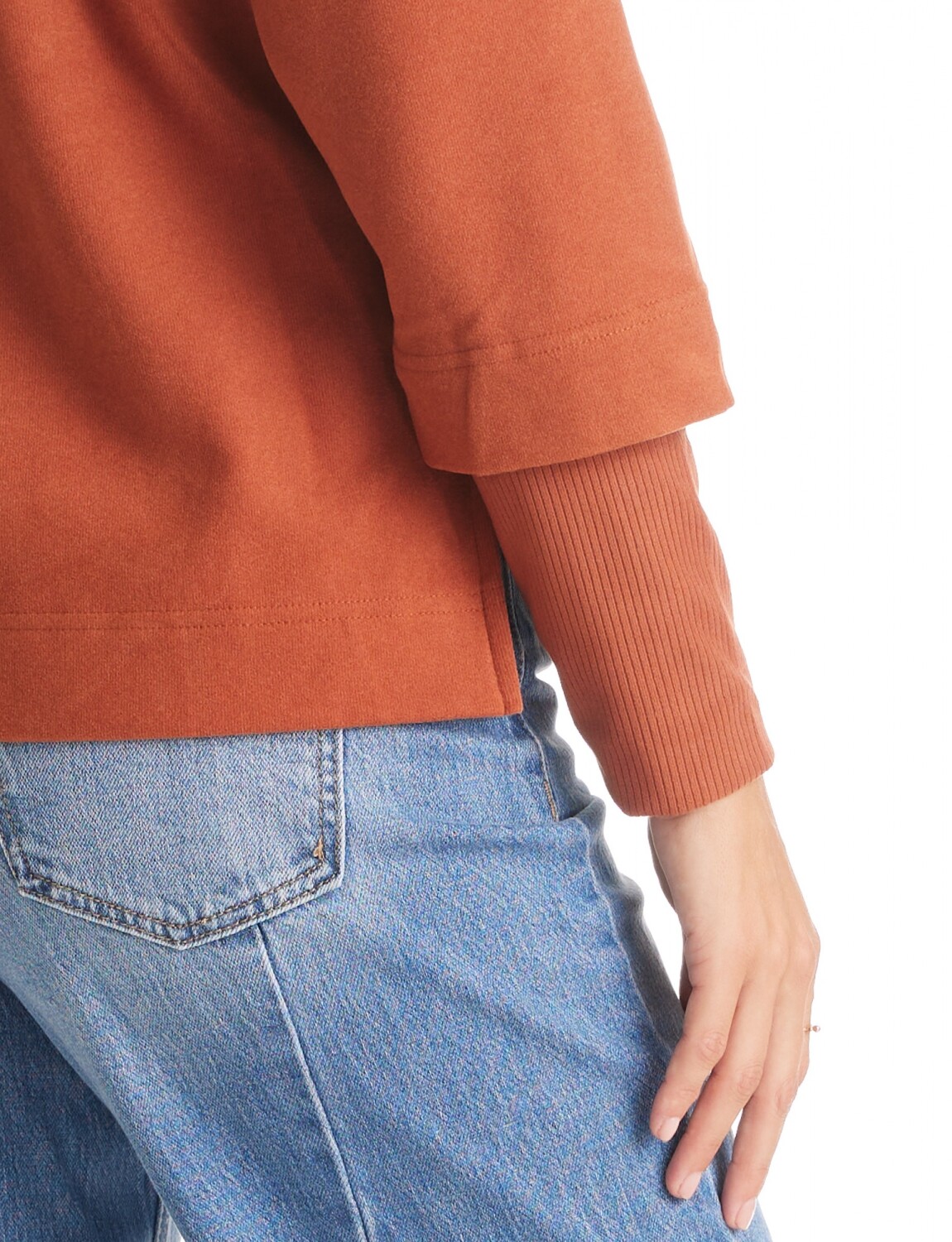 Diseño de hombros caídos mangas de largo 3 / 4 y corte amplio, que revelan unos puños de tejido rib al tono, los cuales se extienden para cubrir las muñecas.