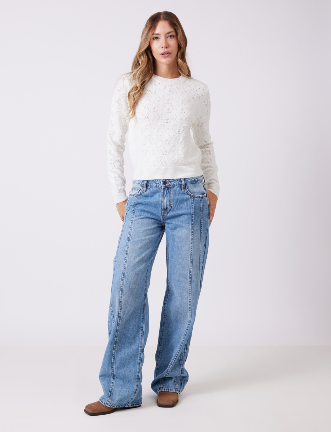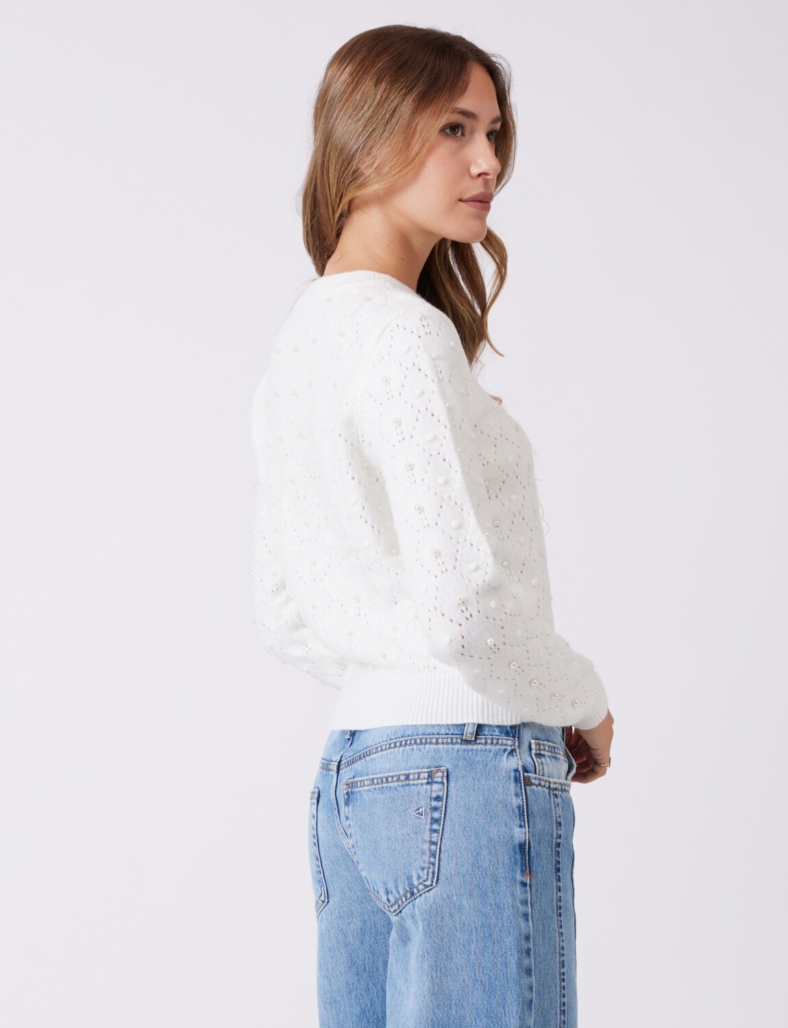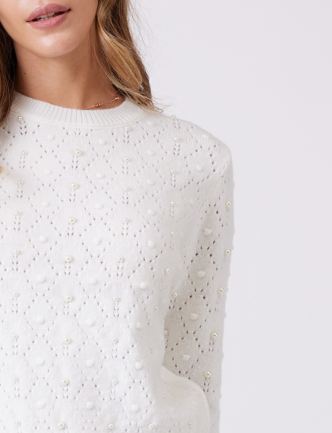 Tejido calado con aplique de perlas.