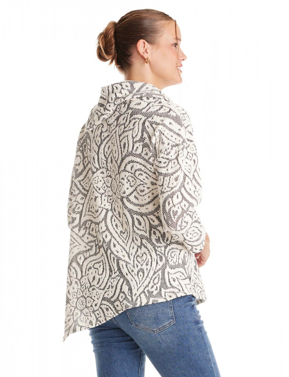 Cuello volcado con aplique de botones situados sobre solapa izquierda.