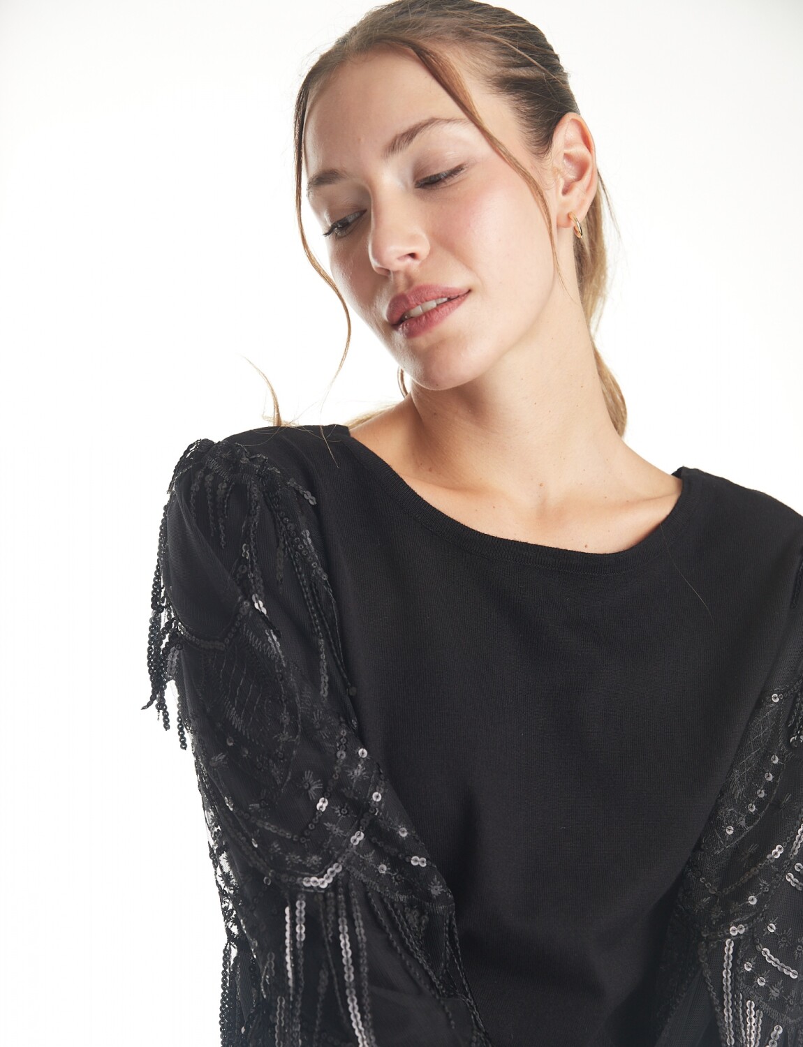 Mangas largas con transparencias en microtul y destellos de lentejuelas bordadas.