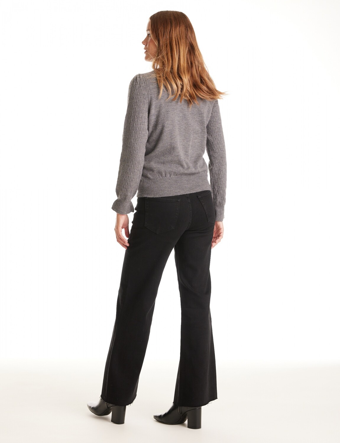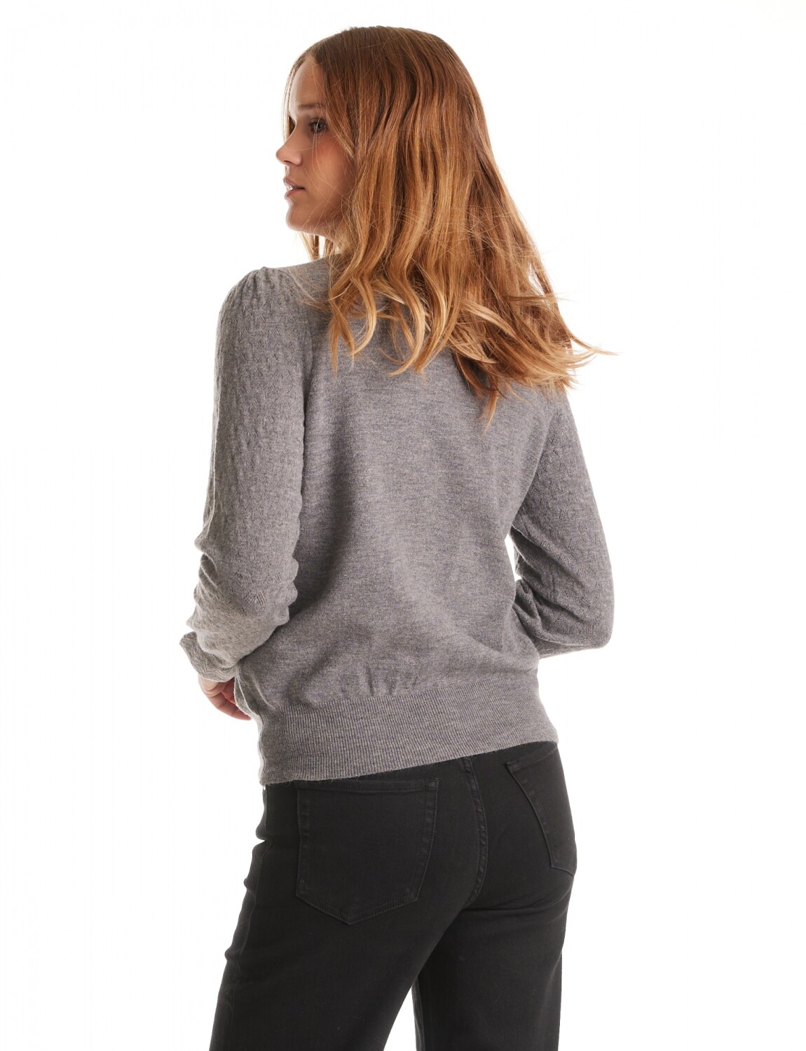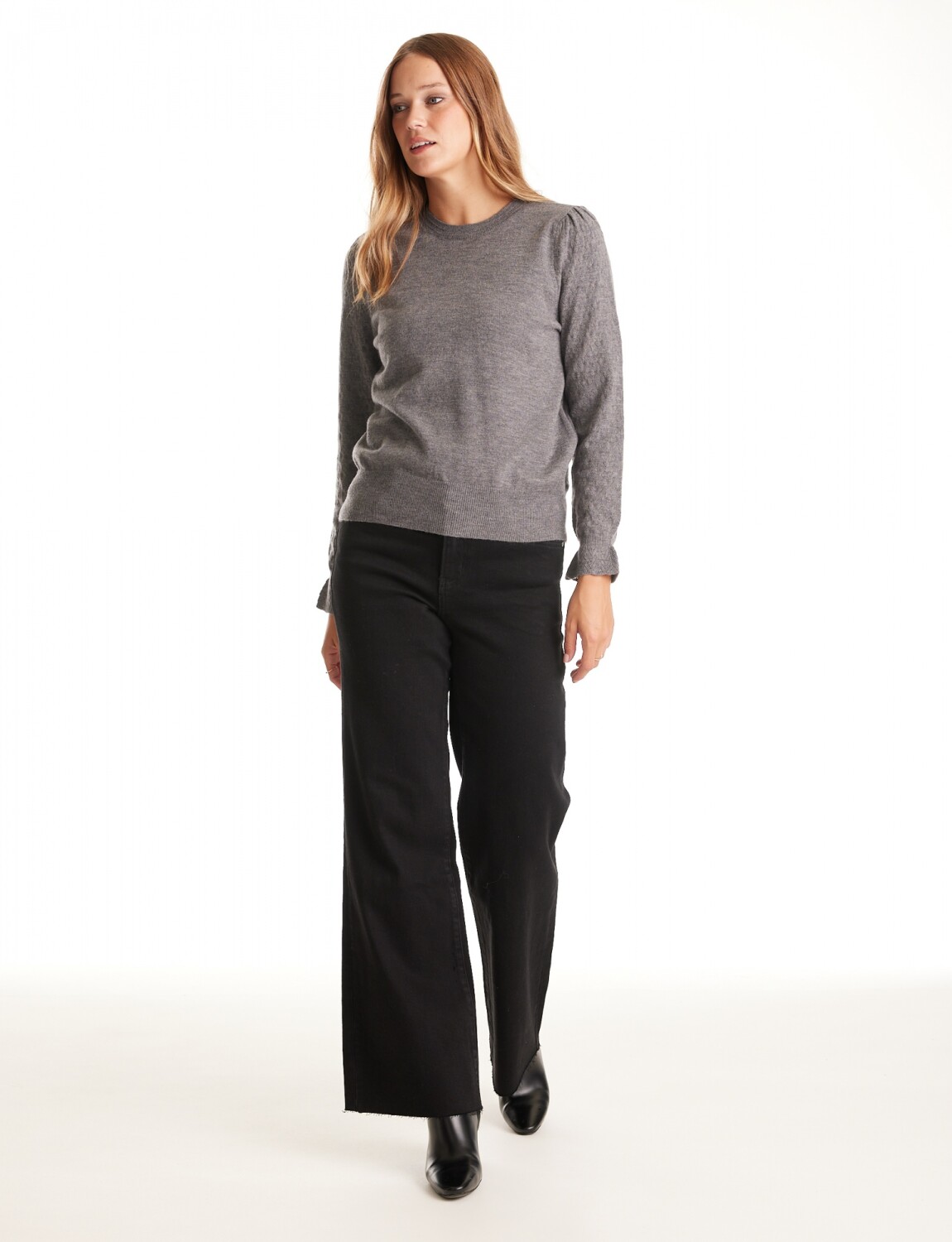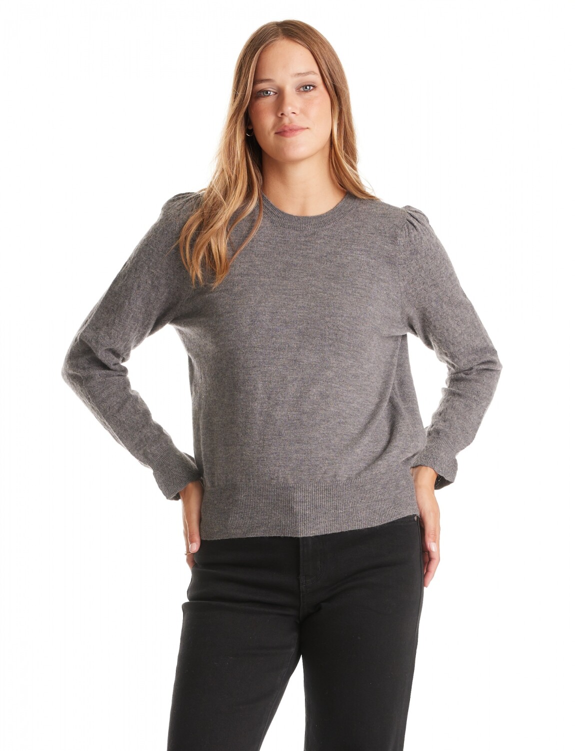 Cuello a la base. Manga larga texturizada con puño y volado.