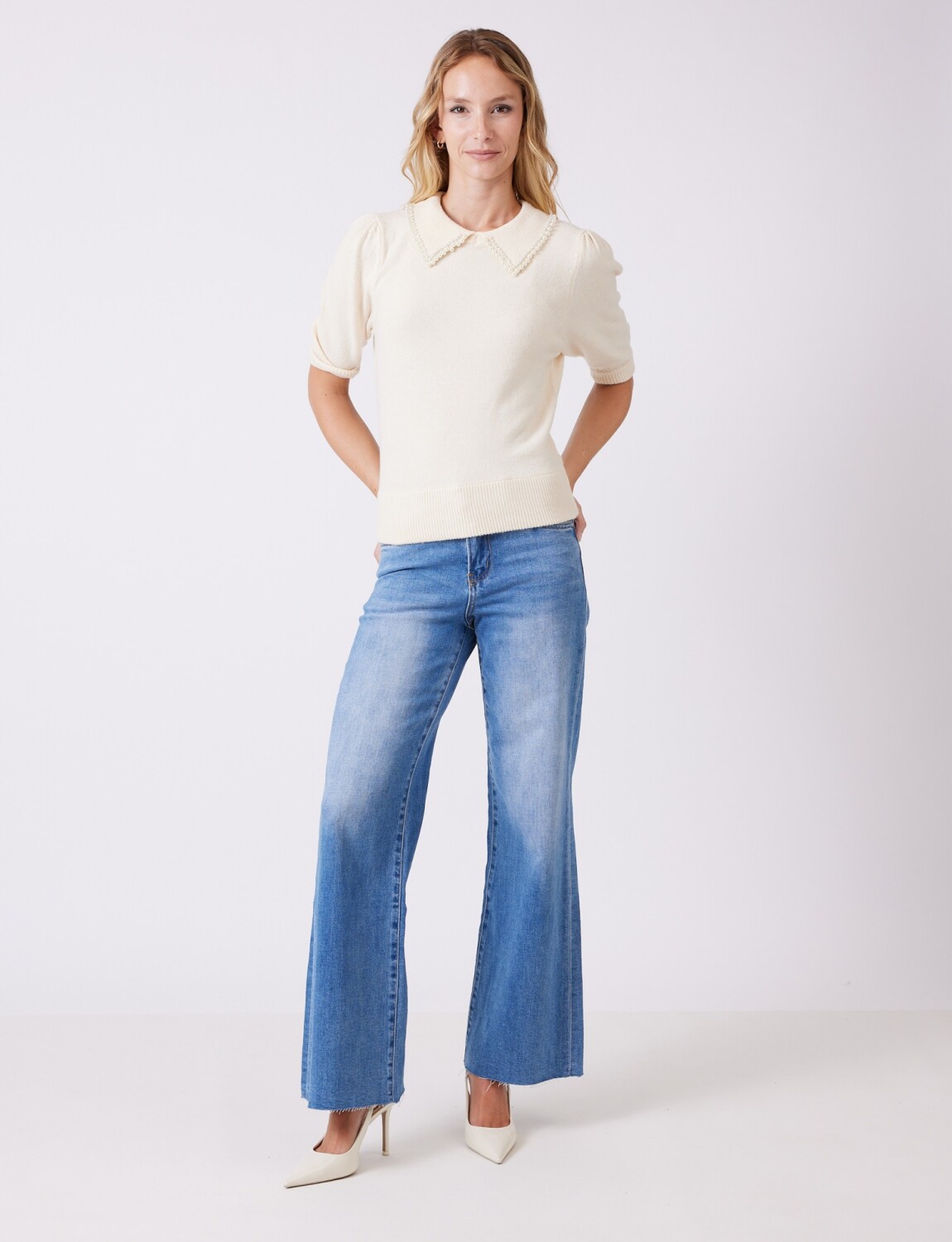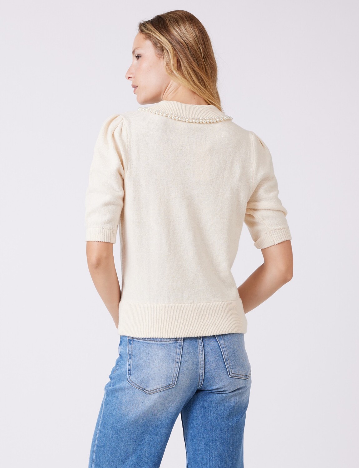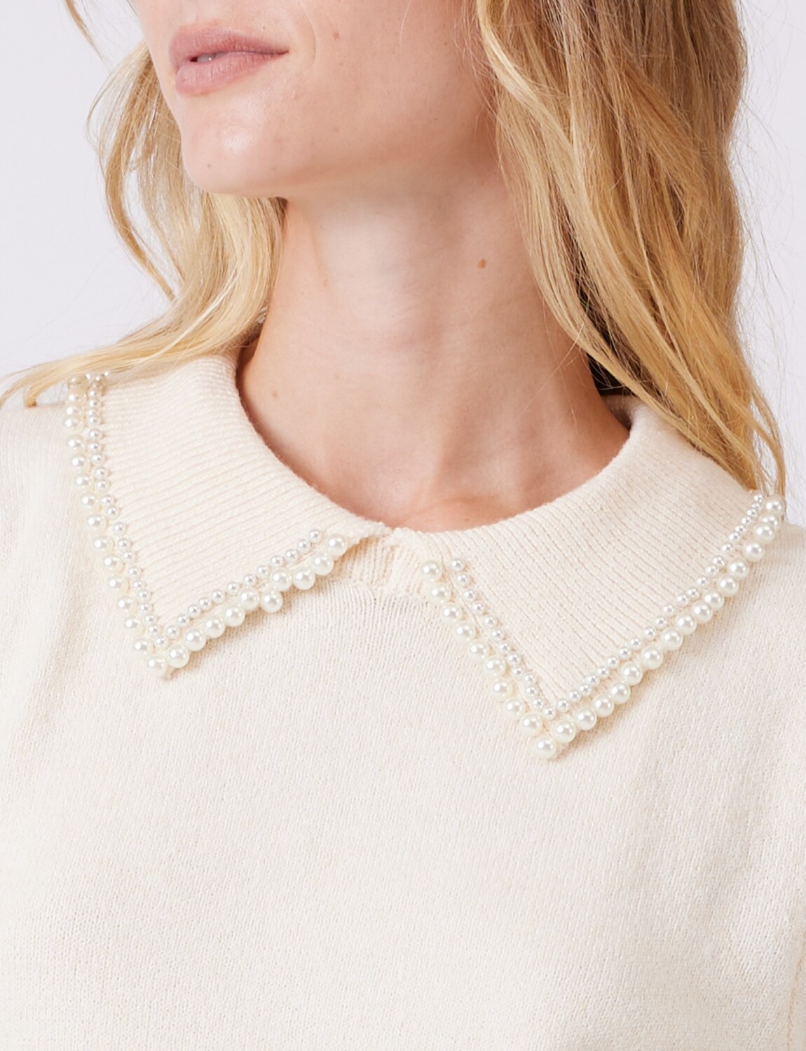 Cuello a la base con solapa y terminación con apliques de perlas.