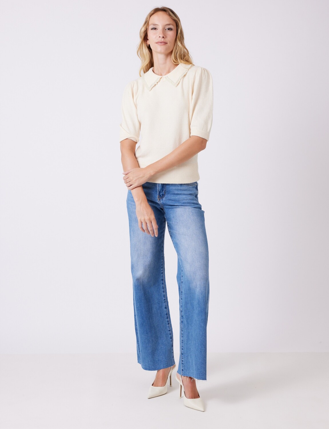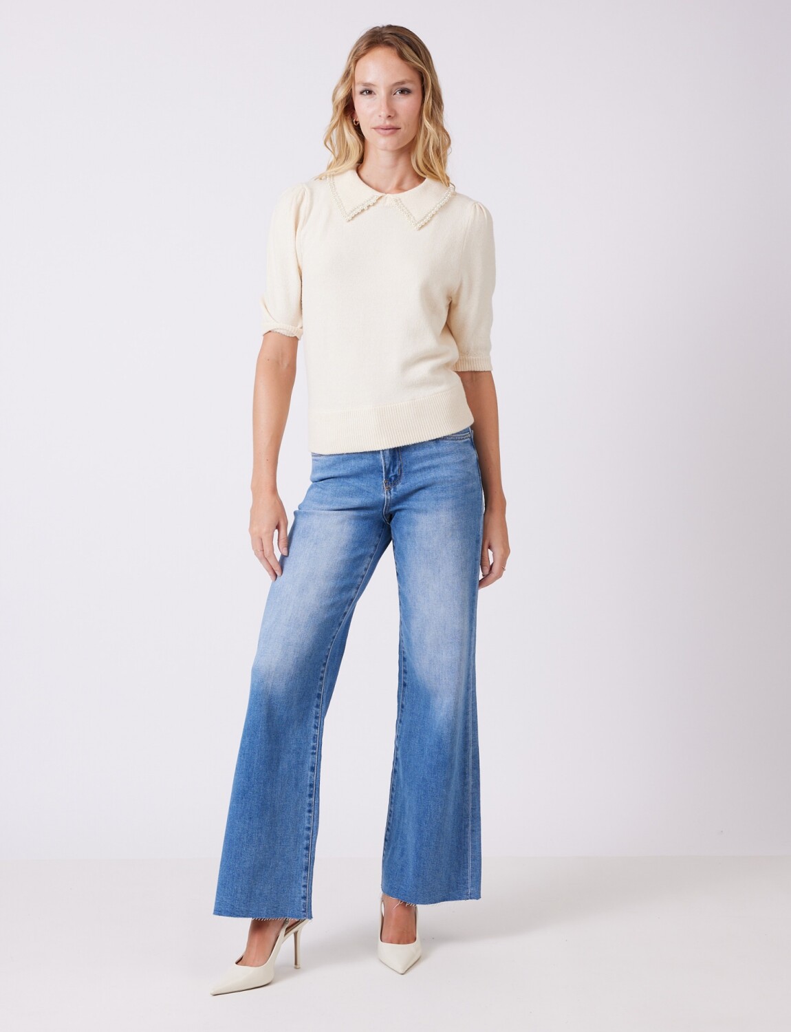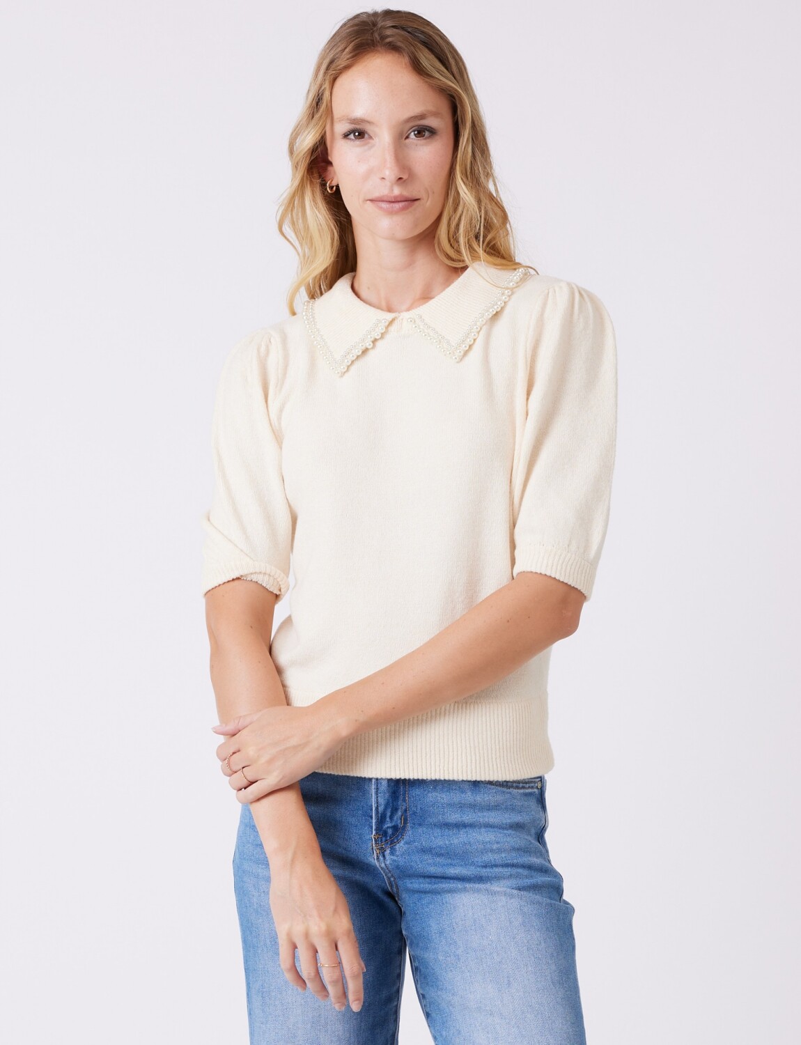 Cuello a la base con solapa y terminación con apliques de perlas.