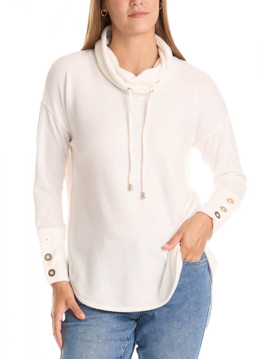 Buzo confeccionado en tejido suave con caída fluida.Cuello volcado ajustable mediante cordones del mismo tono, con punteras metálicas doradas que añaden un toque de brillo.