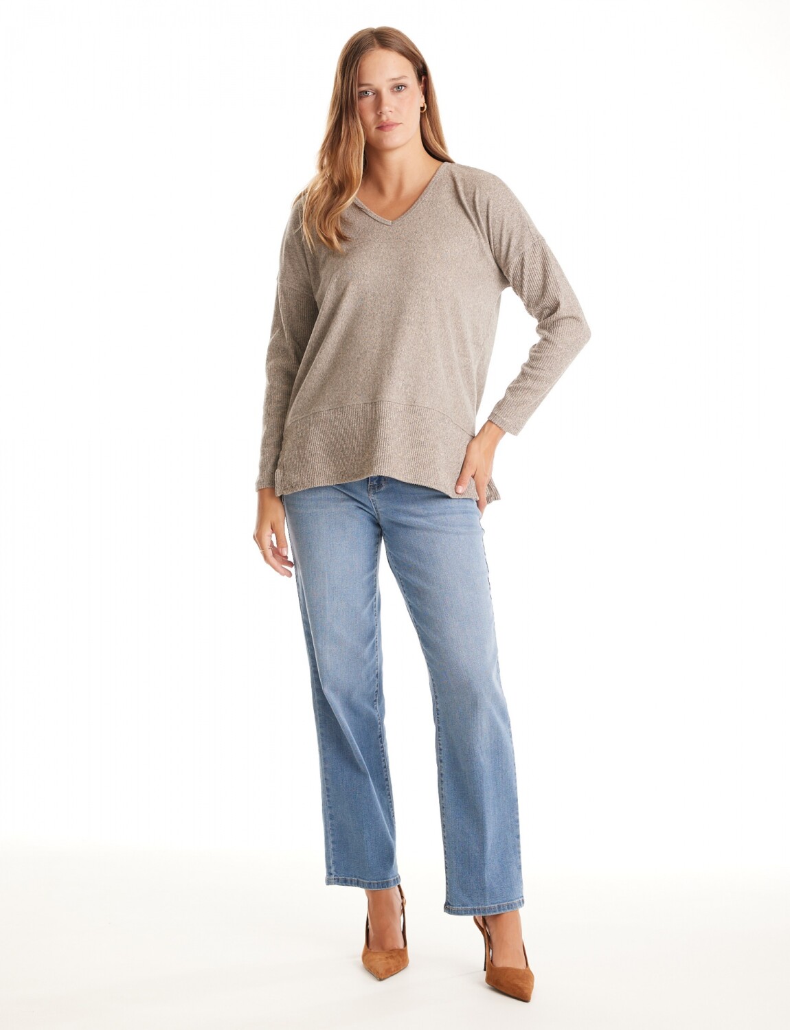 Escote en V y mangas largas con hombros caídos, lo que refuerza su estilo moderno y cómodo.