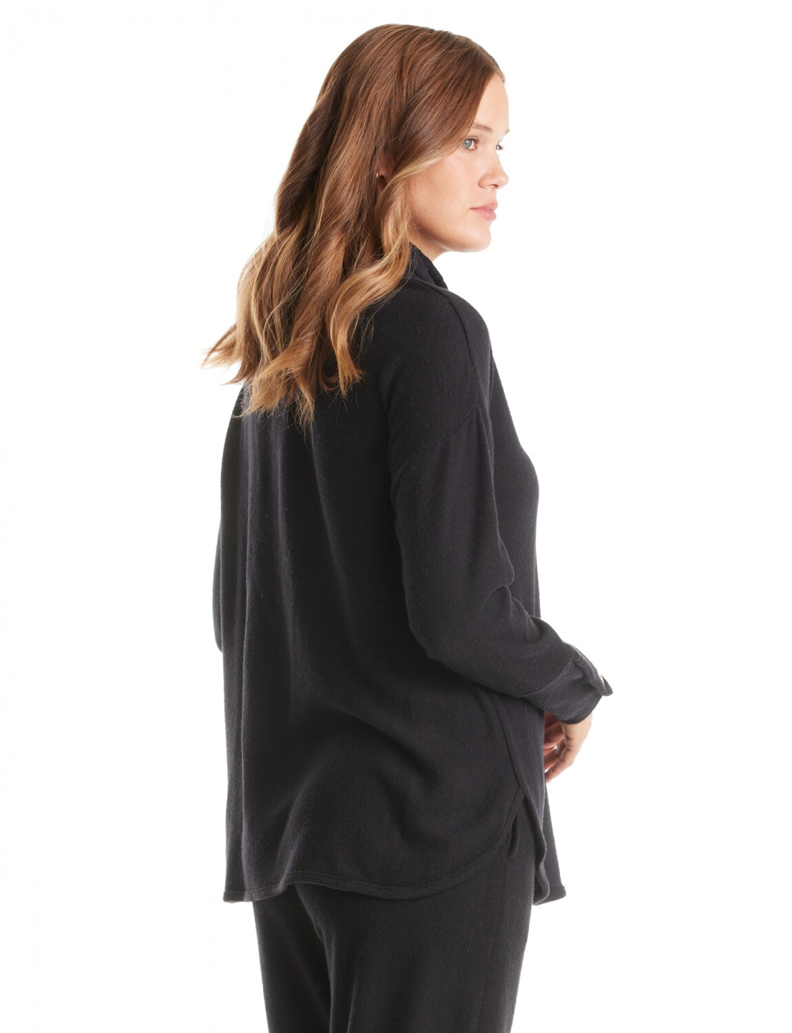 Silueta holgada de hombros caídos y un ruedo redondeado con aberturas laterales para una mejor caída.
