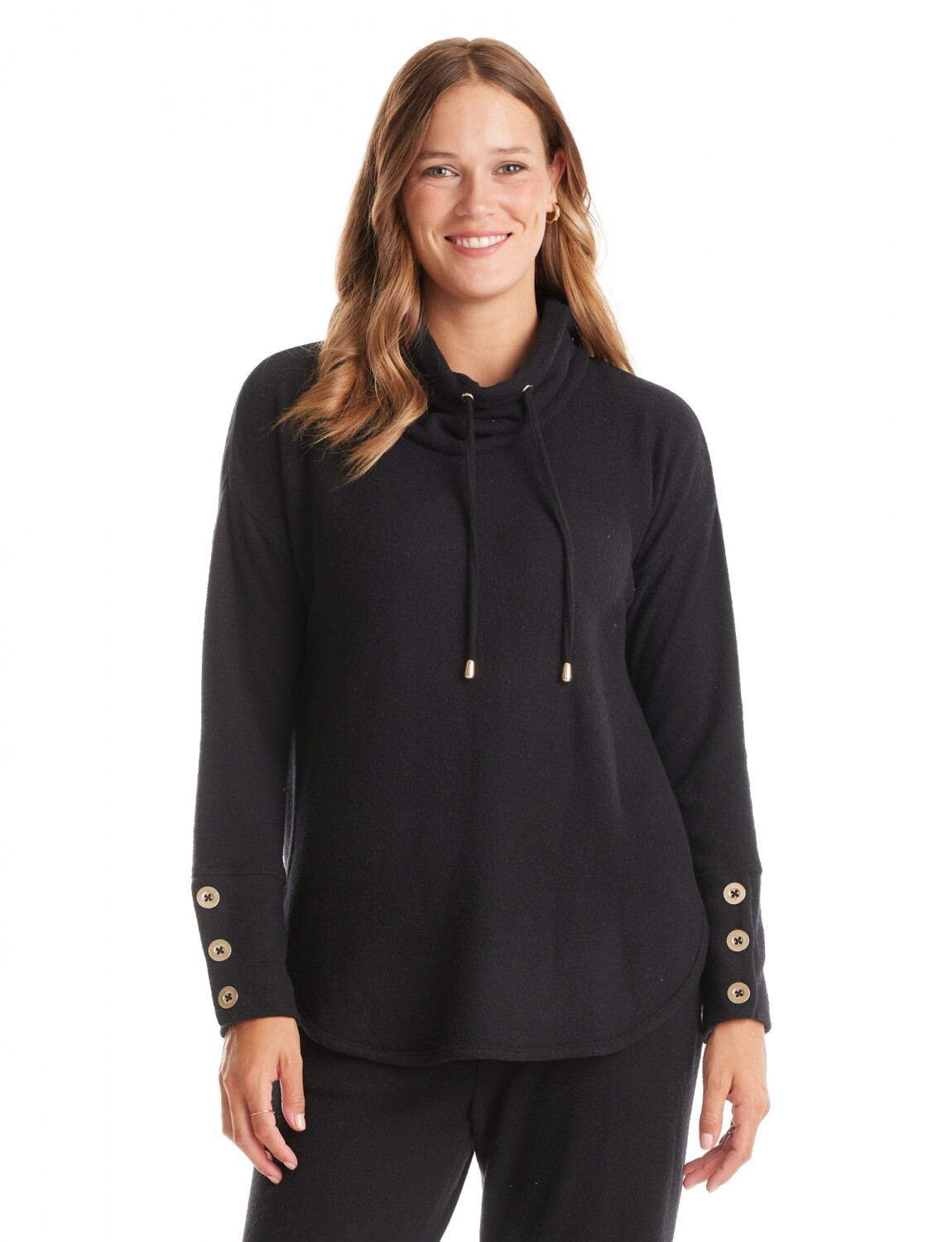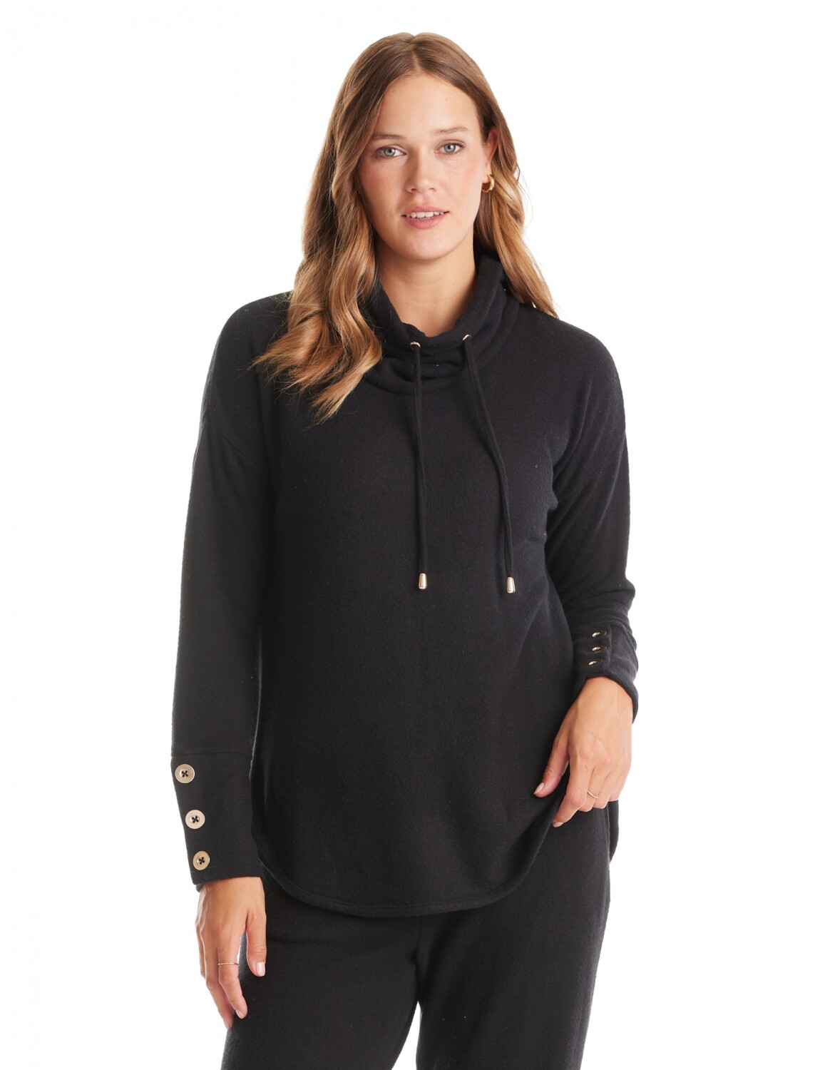 Buzo confeccionado en tejido suave con caída fluida.Cuello volcado ajustable mediante cordones del mismo tono, con punteras metálicas doradas que añaden un toque de brillo.