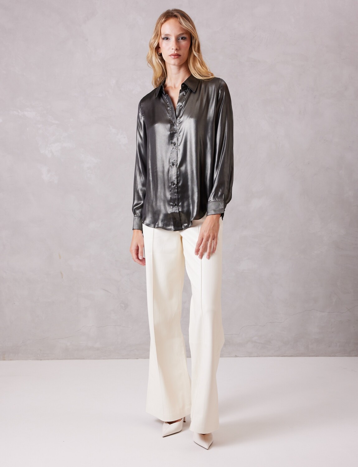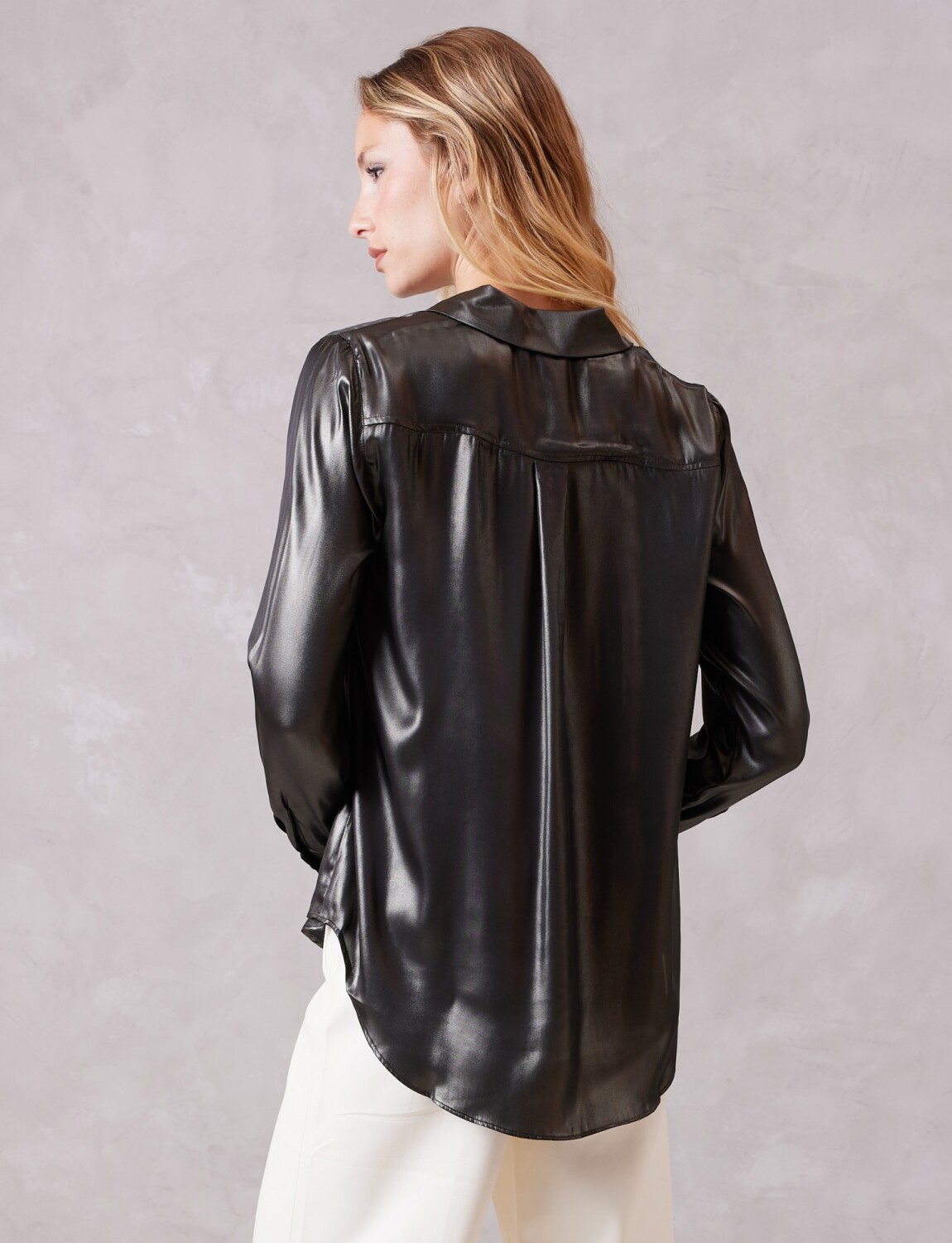 Esta camisa satinada de efecto metalizado destaca por su acabado de brillo intenso que emula el metal líquido, capturando la luz con cada movimiento.