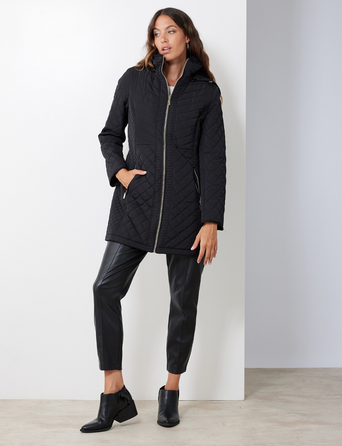 Campera capitoneada de corte largo se destaca por su costuras multidireccionales: combina un patrón de rombos en el cuerpo con laterales y detalles en hombros de capitoneado lineal, un recurso visual que define y estiliza la silueta.