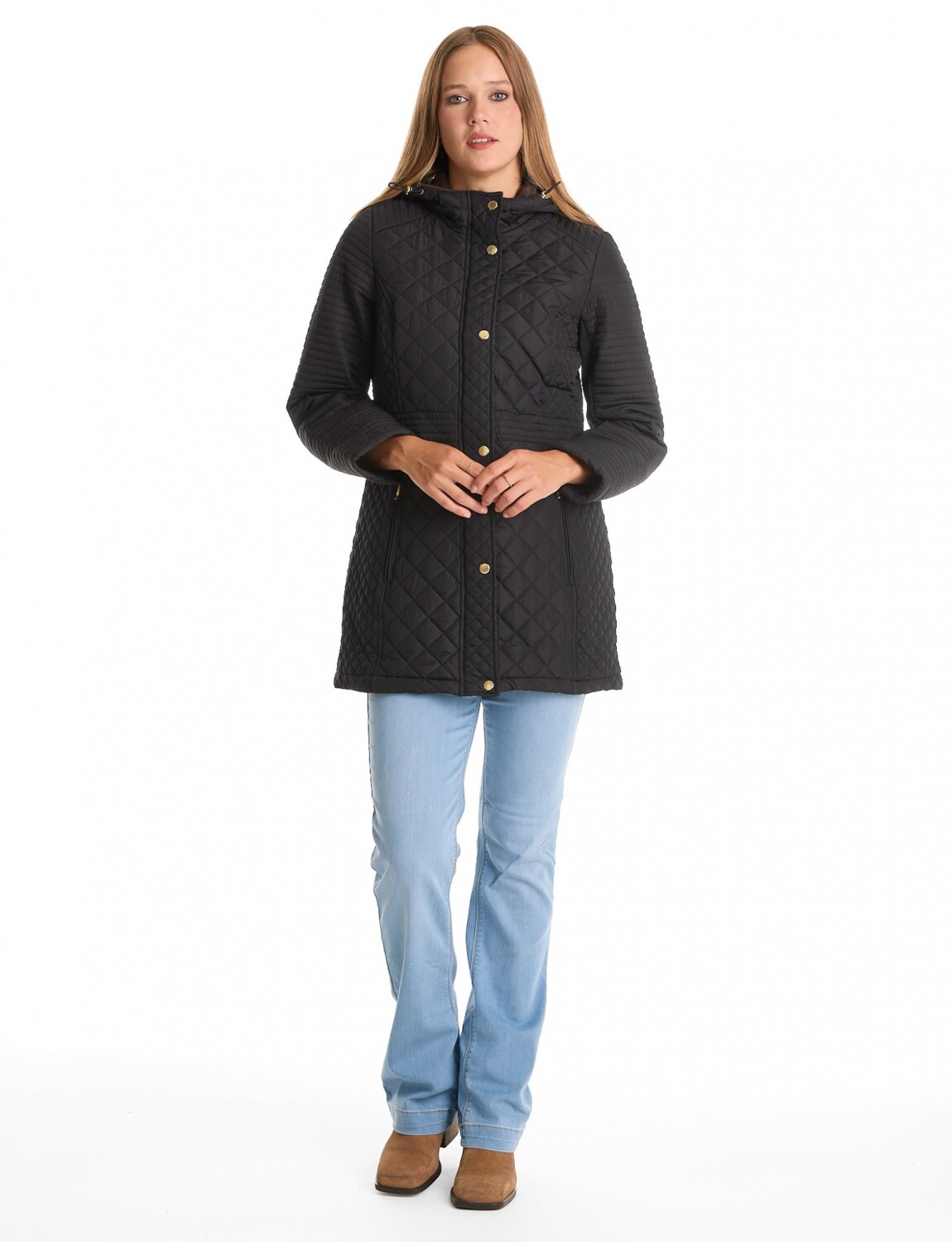 El cuerpo de la prenda presenta un capitoneado en rombos pequeños que aporta una estética clásica y sastrera.
