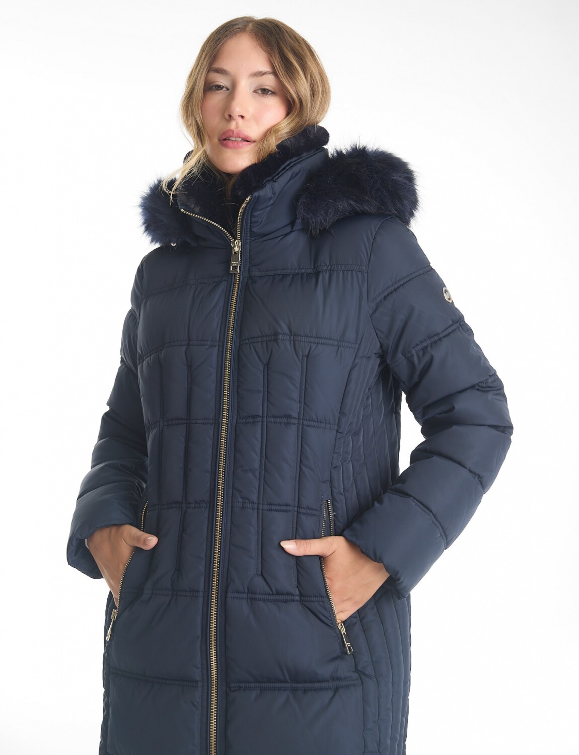 Capucha en piel sintética desmontable, permitiendo adaptar el look y el nivel de abrigo según la ocasión.