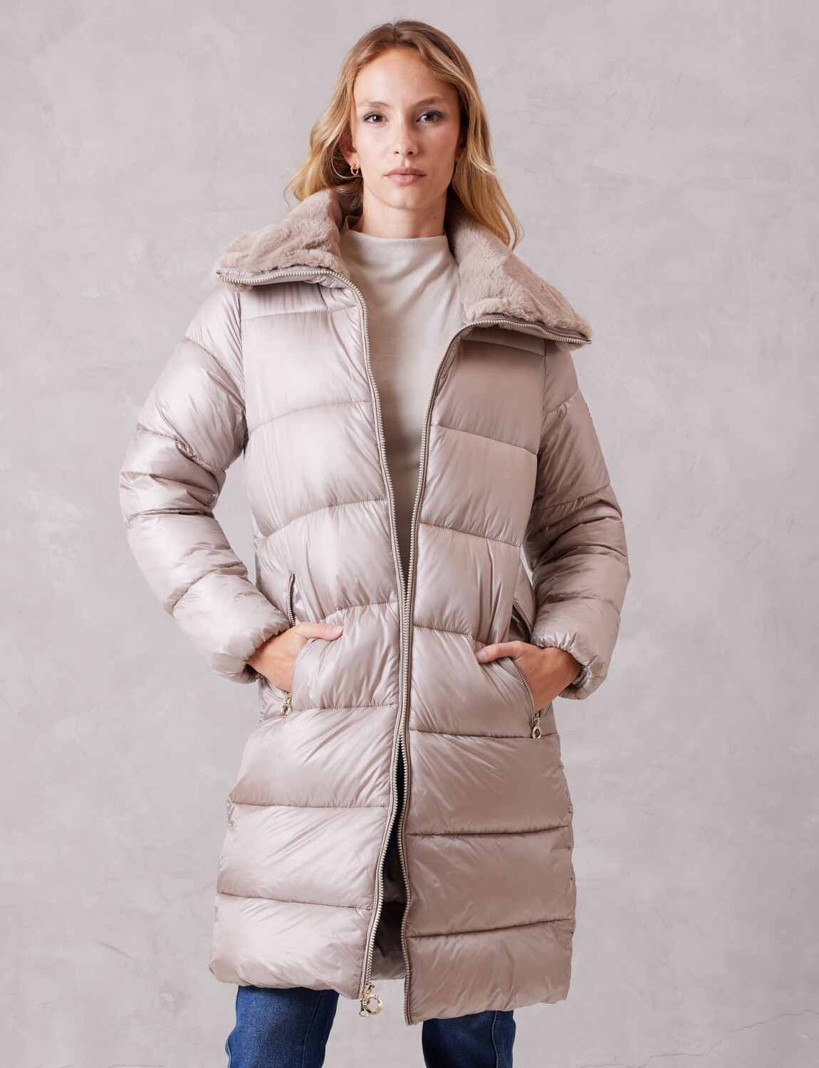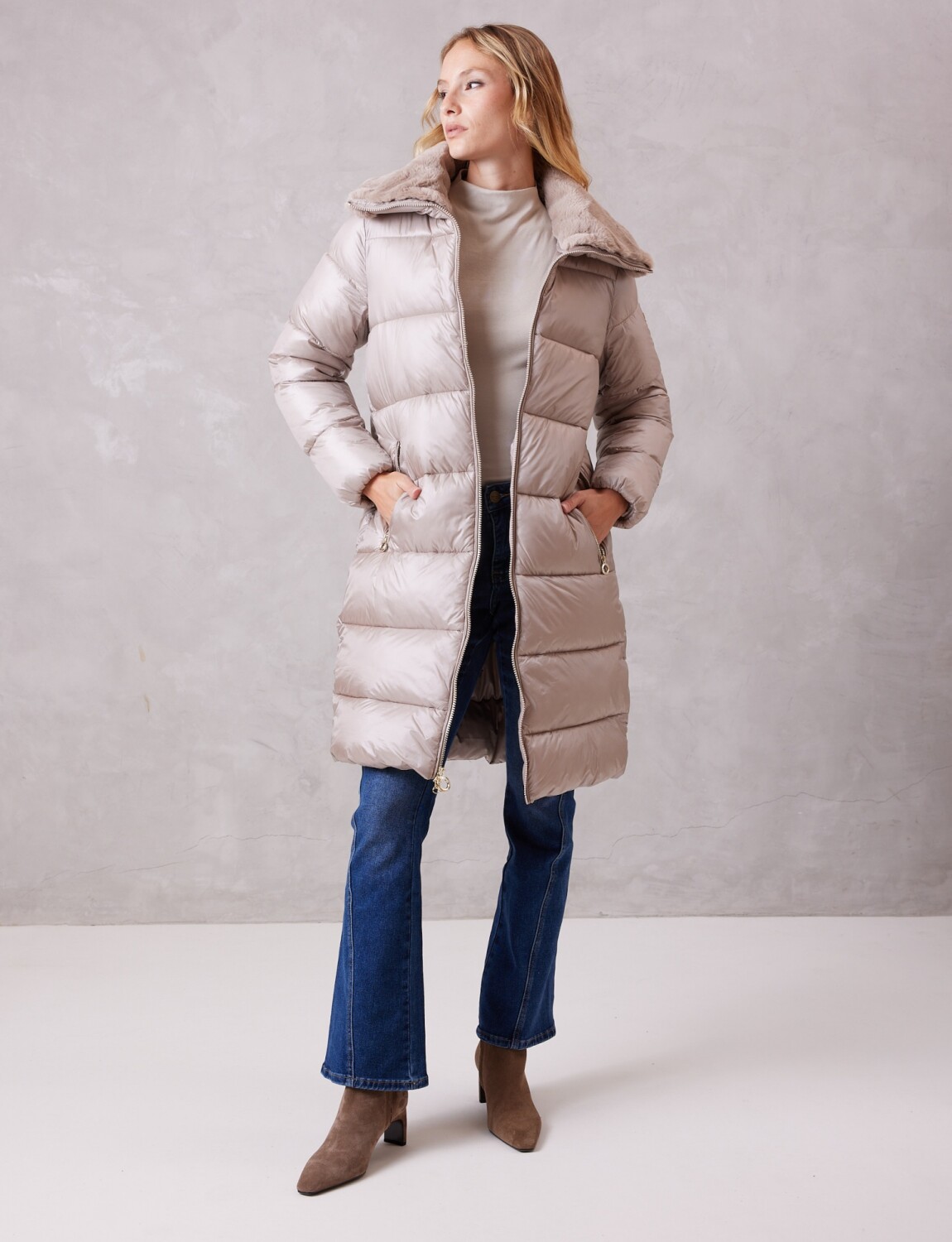 Campera larga capitoneada con acabado satinado aportando luminosidad sutil a los conjuntos invernales.