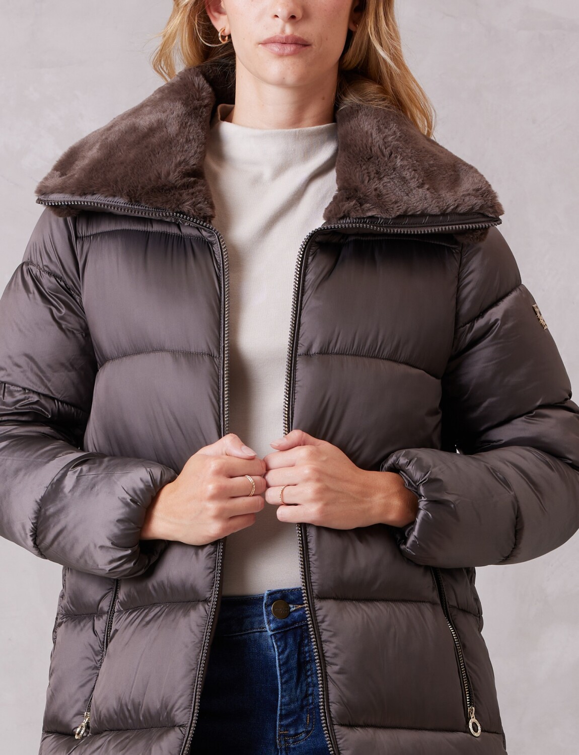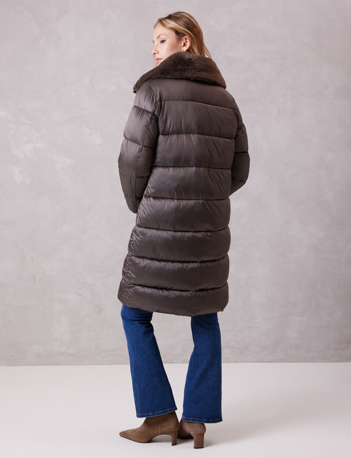 Campera Puffer Satinada Con Cuello De Piel - Marron