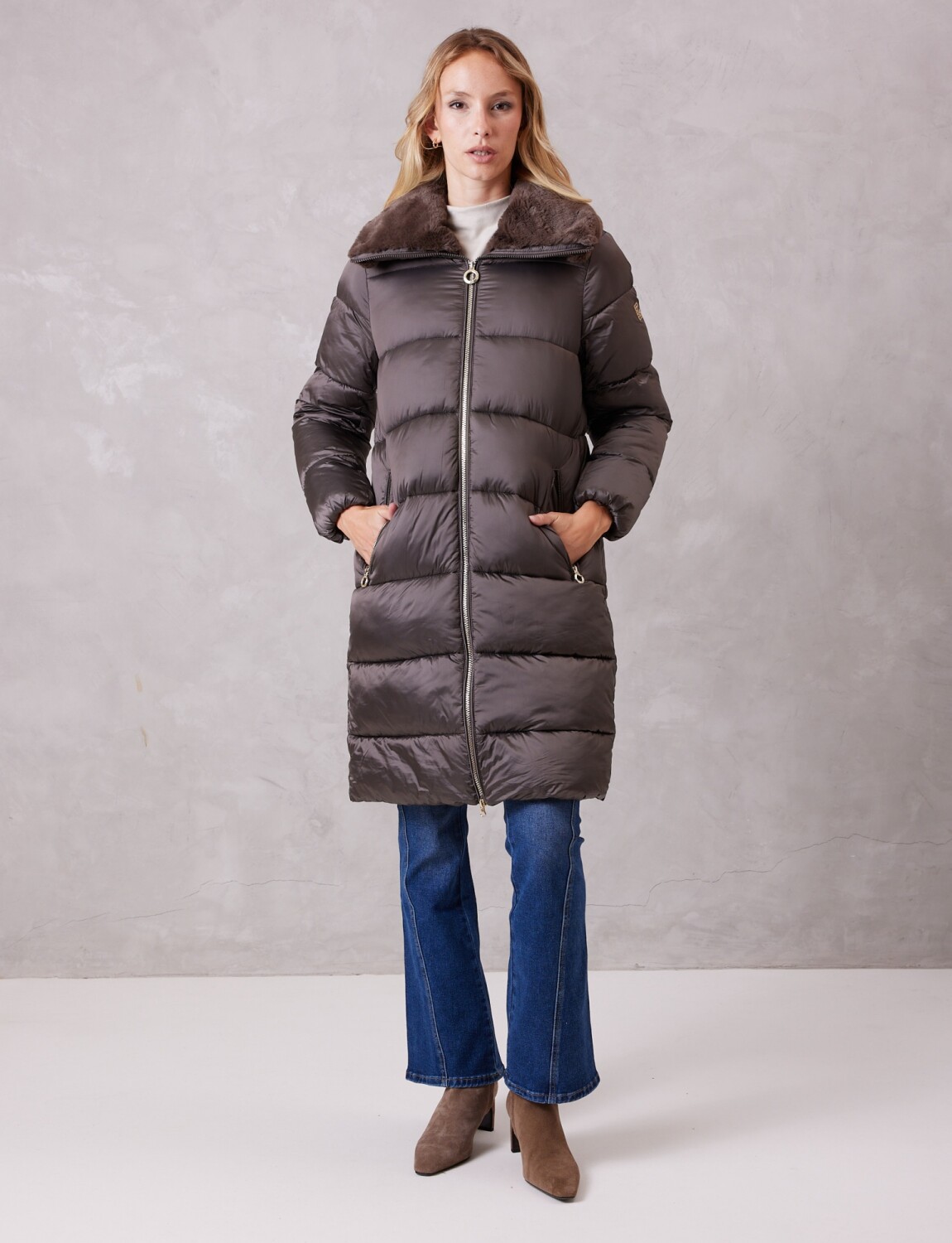 Campera larga capitoneada con acabado satinado aportando luminosidad sutil a los conjuntos invernales.