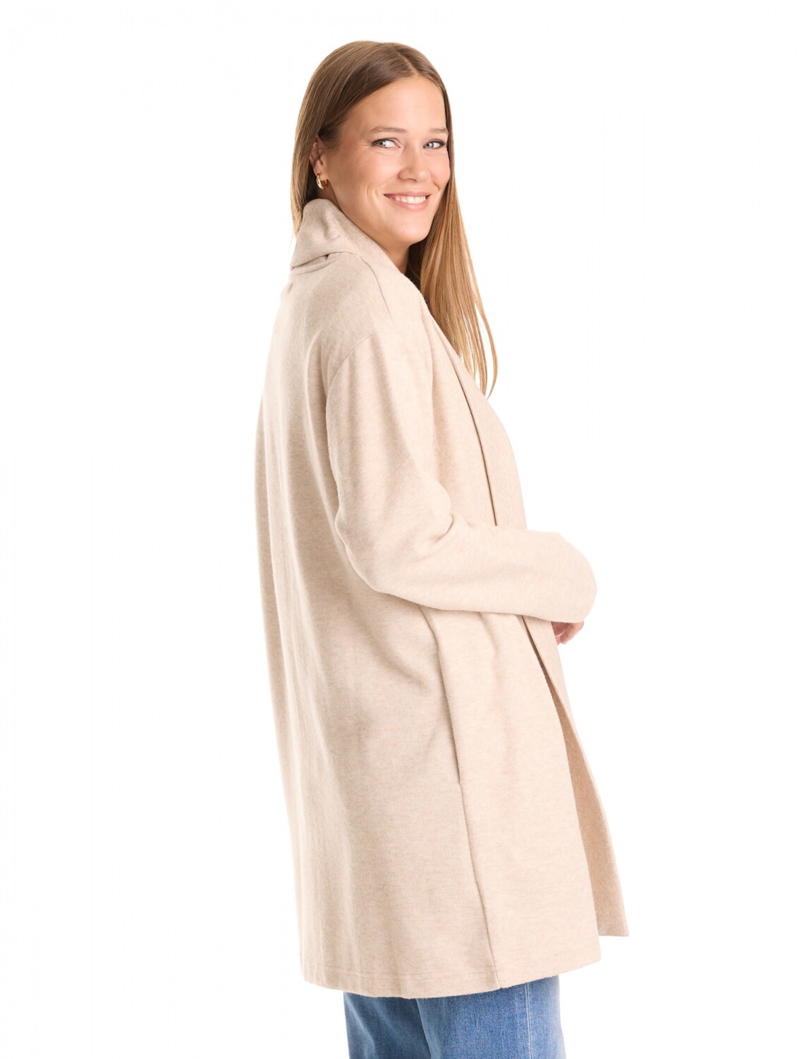 Este cárdigan largo se destaca por su confección en un tejido de punto suave.