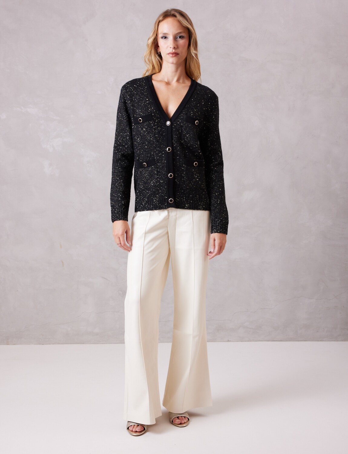 Cárdigan con fibras de lurex creando un efecto de brillos sobre el fondo oscuro, ideal para transicionar de un look de oficina a uno de noche.