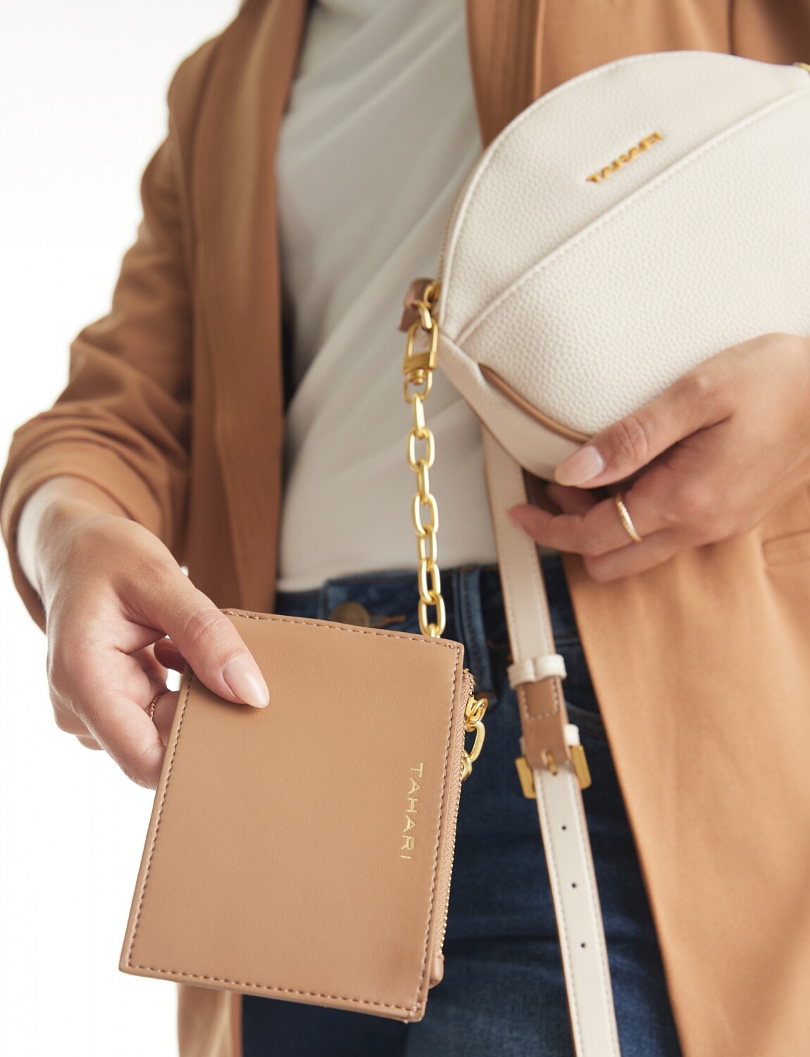 Bolsillo plano exterior con logo Tahari en altoelieve metálico.