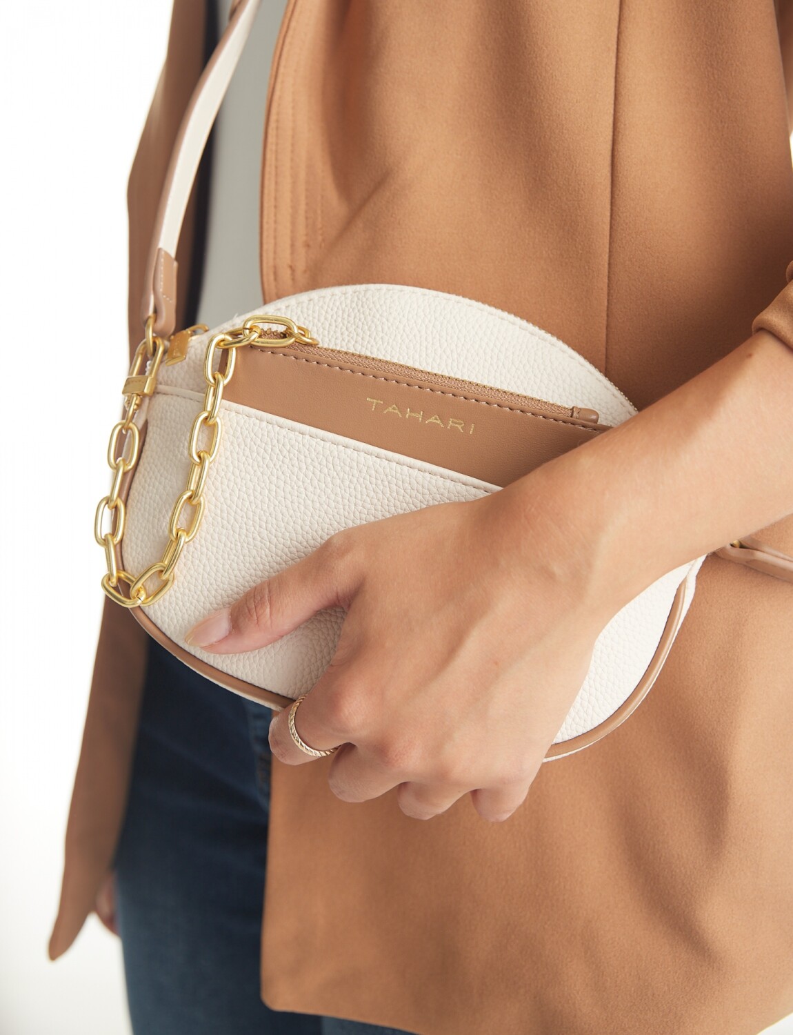 Cartera tipo bandolera con silueta de media luna y bordes redondeados.