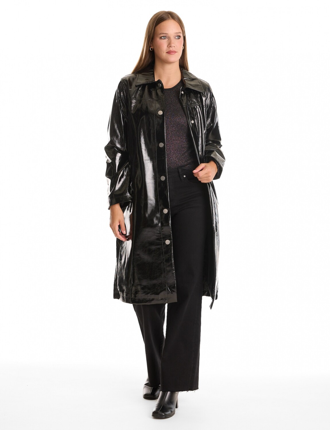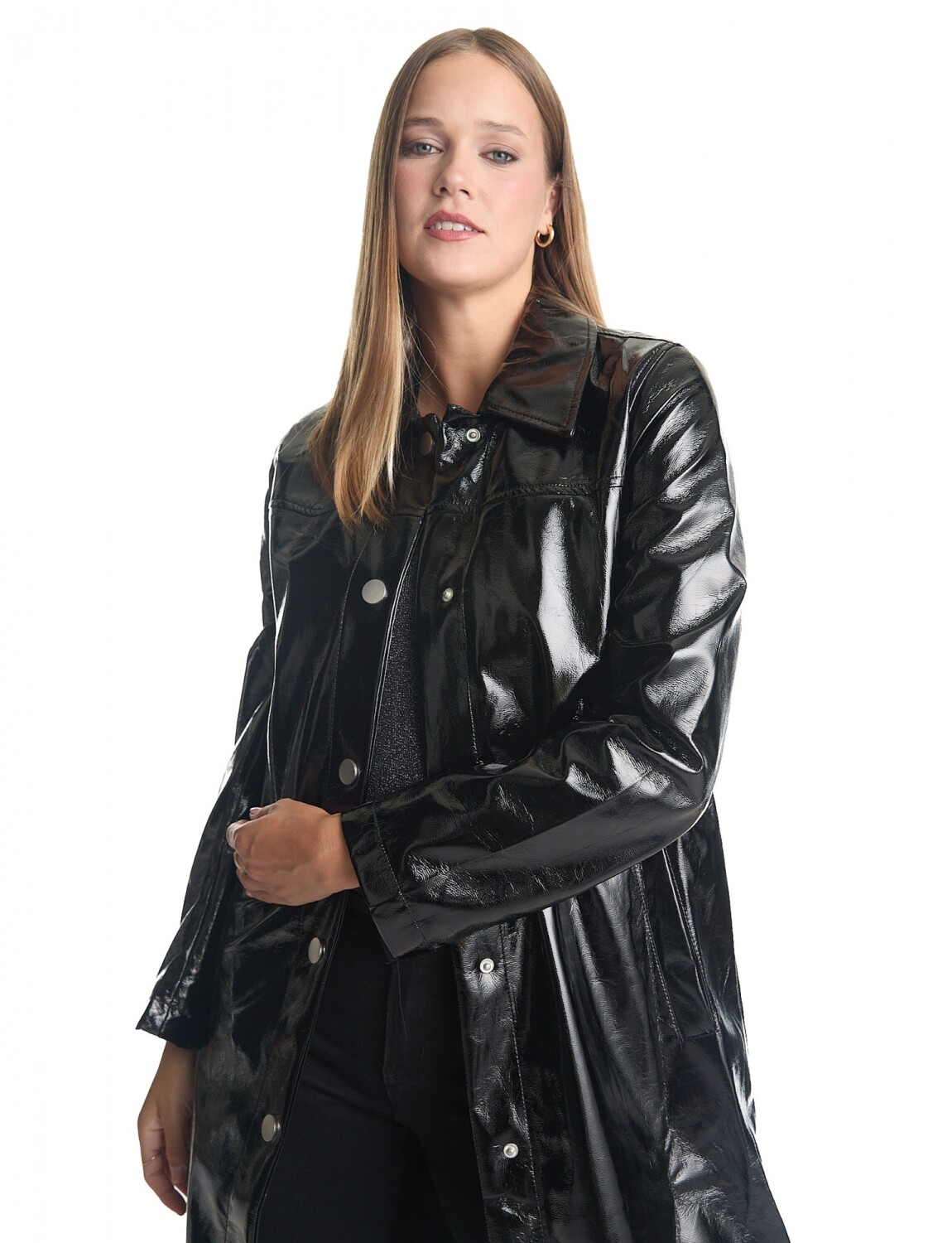 Chaqueta charol con textura impermeable y moderna.