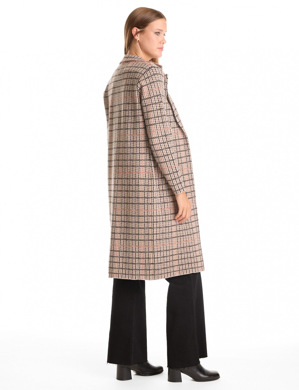 Cuello con solapa y caída abierta sin botones, reforzando una estética minimalista y moderna