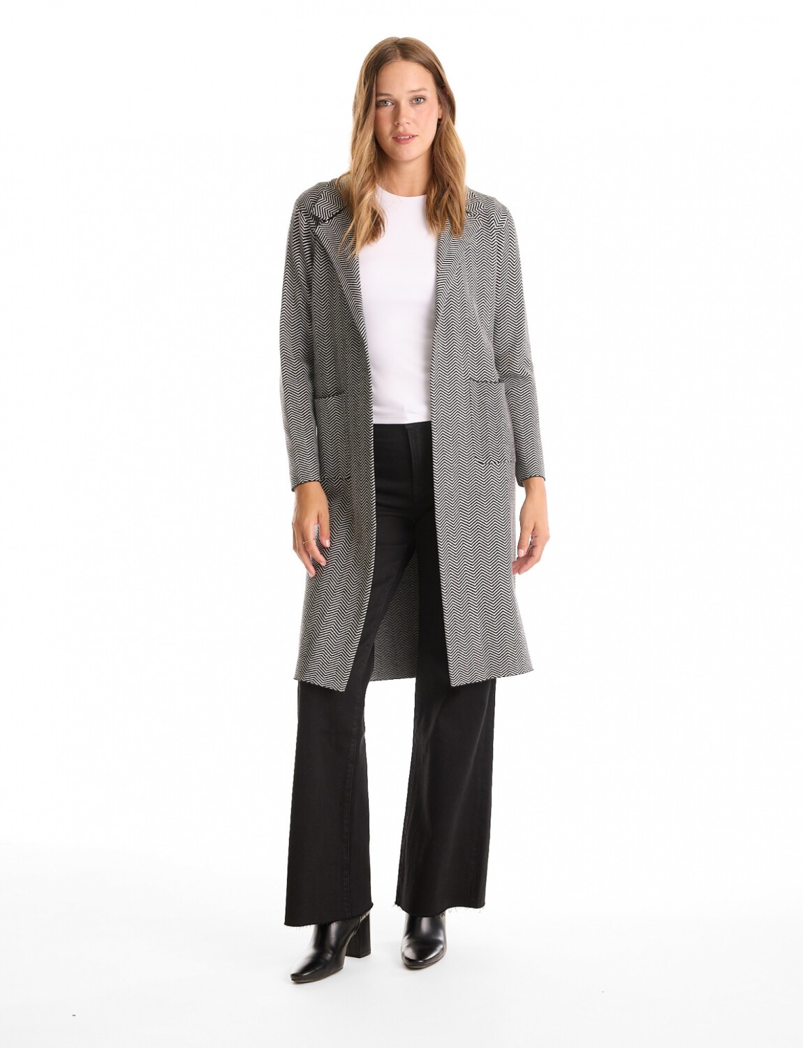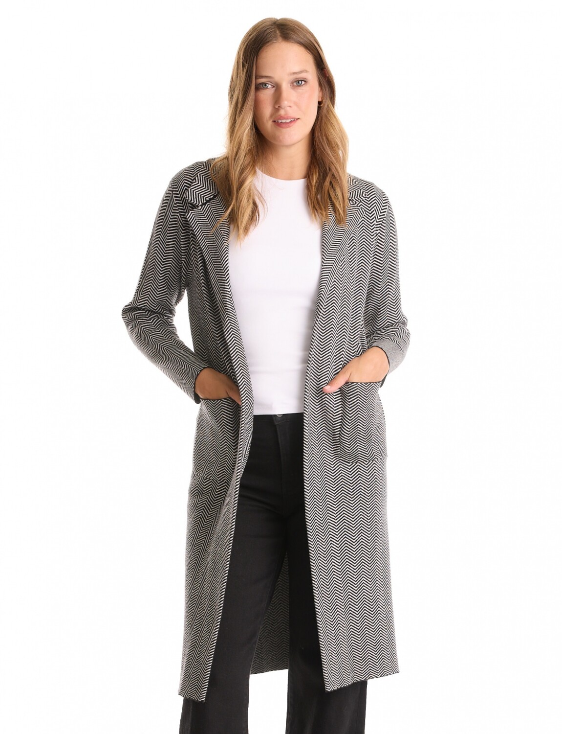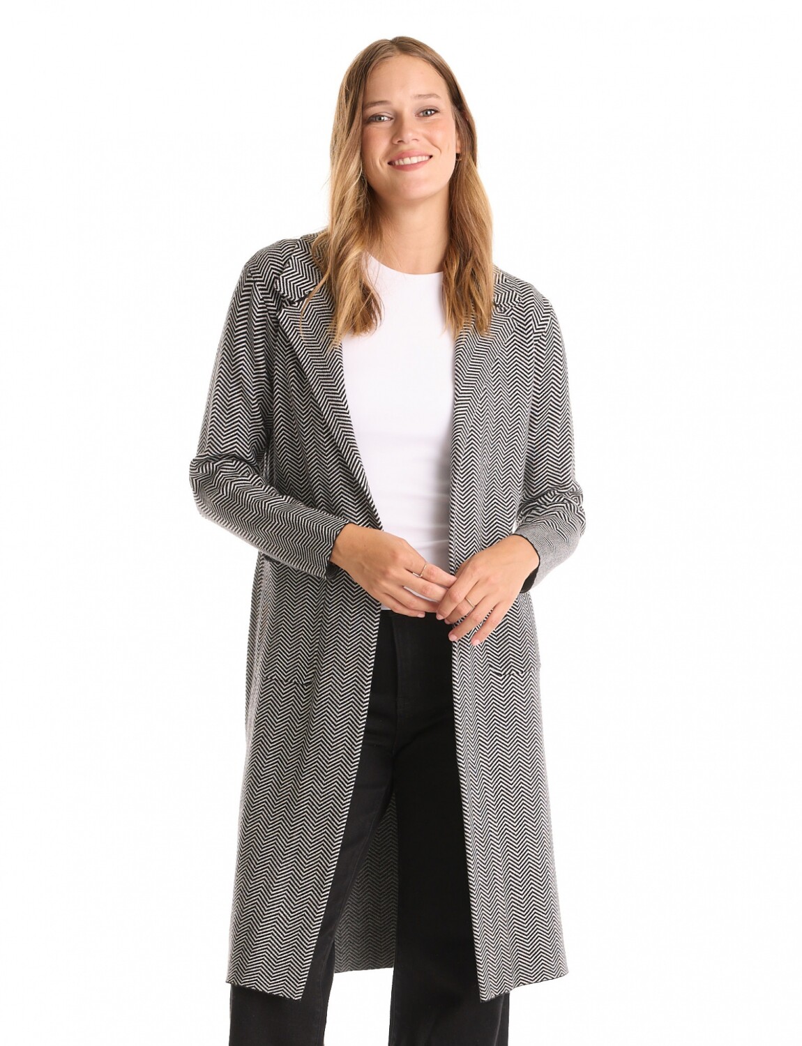 Chaqueta larga confeccionada en tejido de punto con estampa en contraste negro y blanco.
