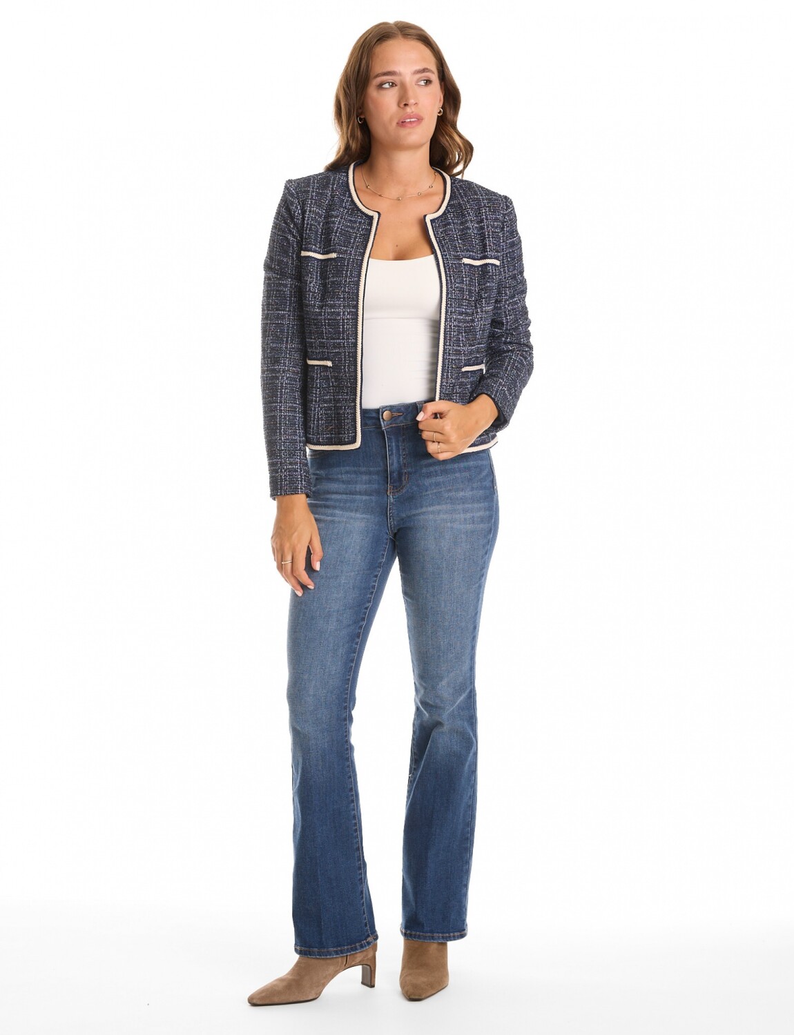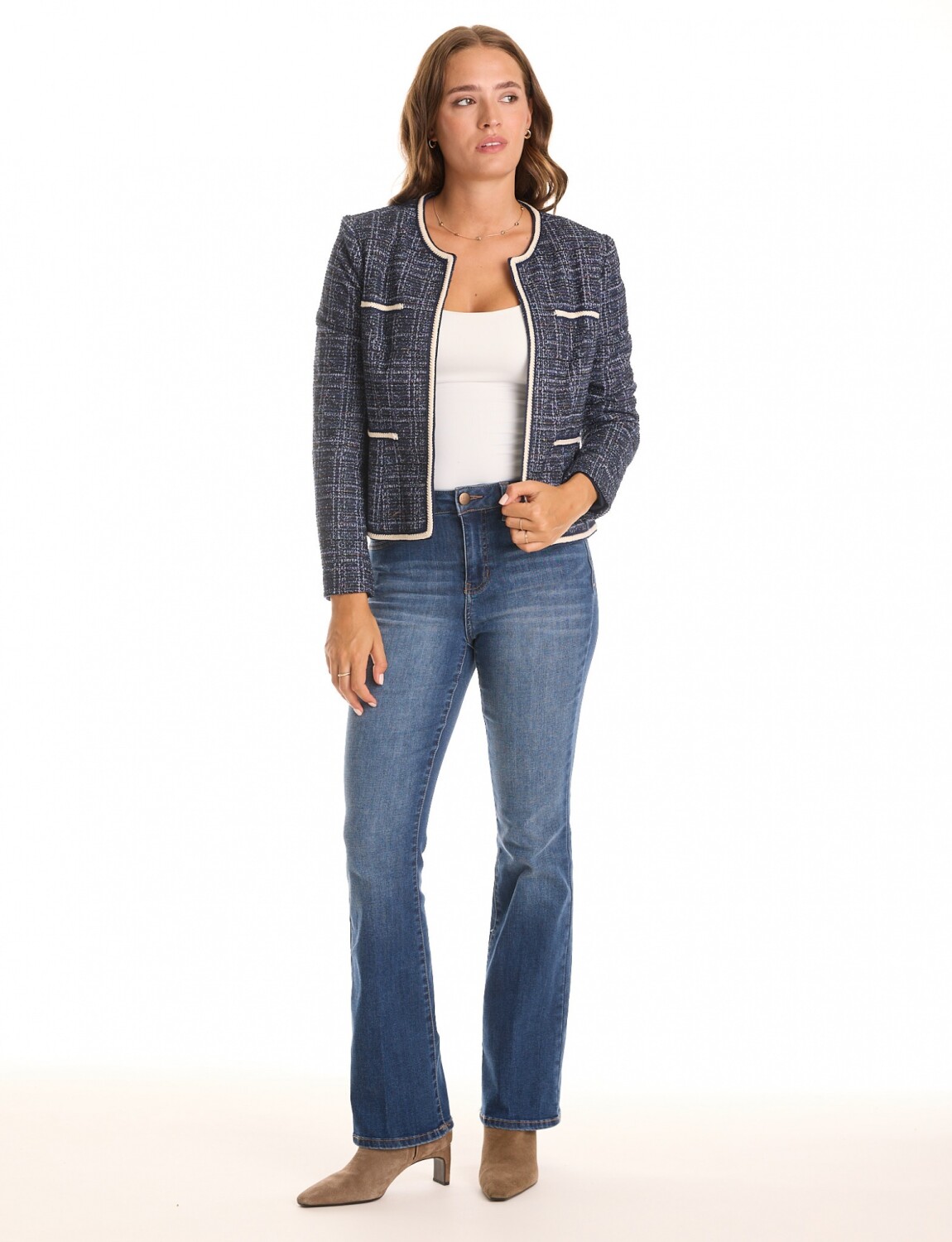 Chaqueta en tejido tweed con sutiles destellos de lúrex, marca Nanette.