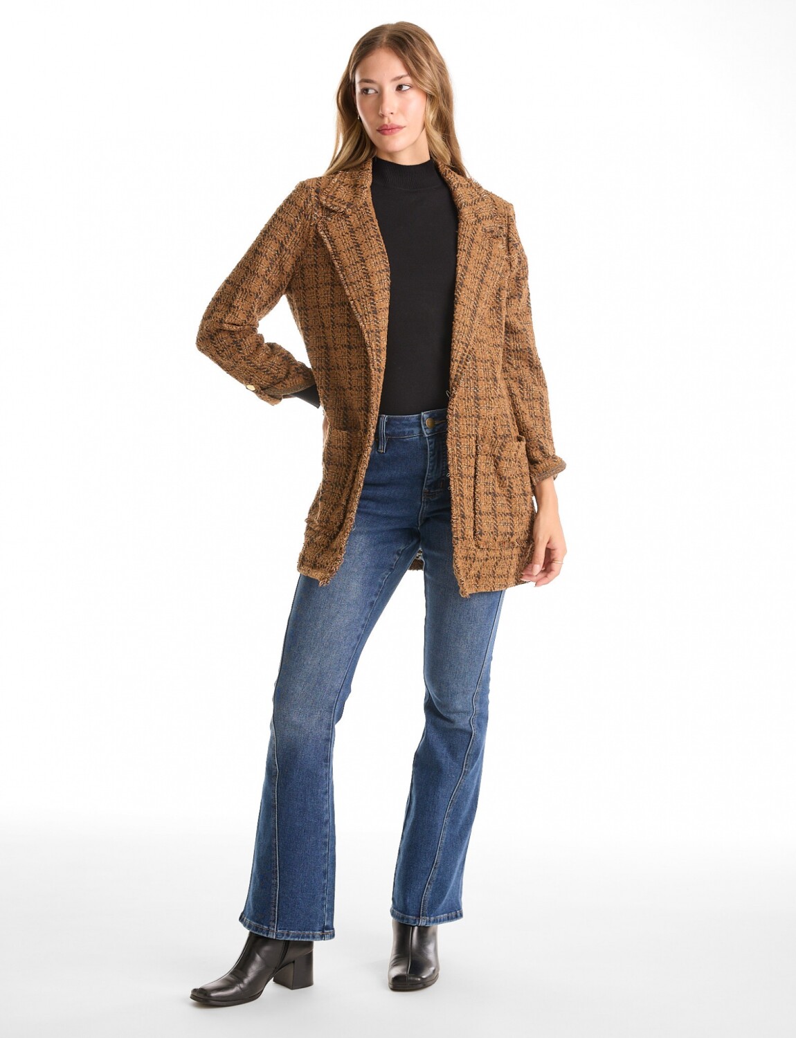 Chaqueta confeccionada en tejido tweed con hilos metálicos integrados en su trama.