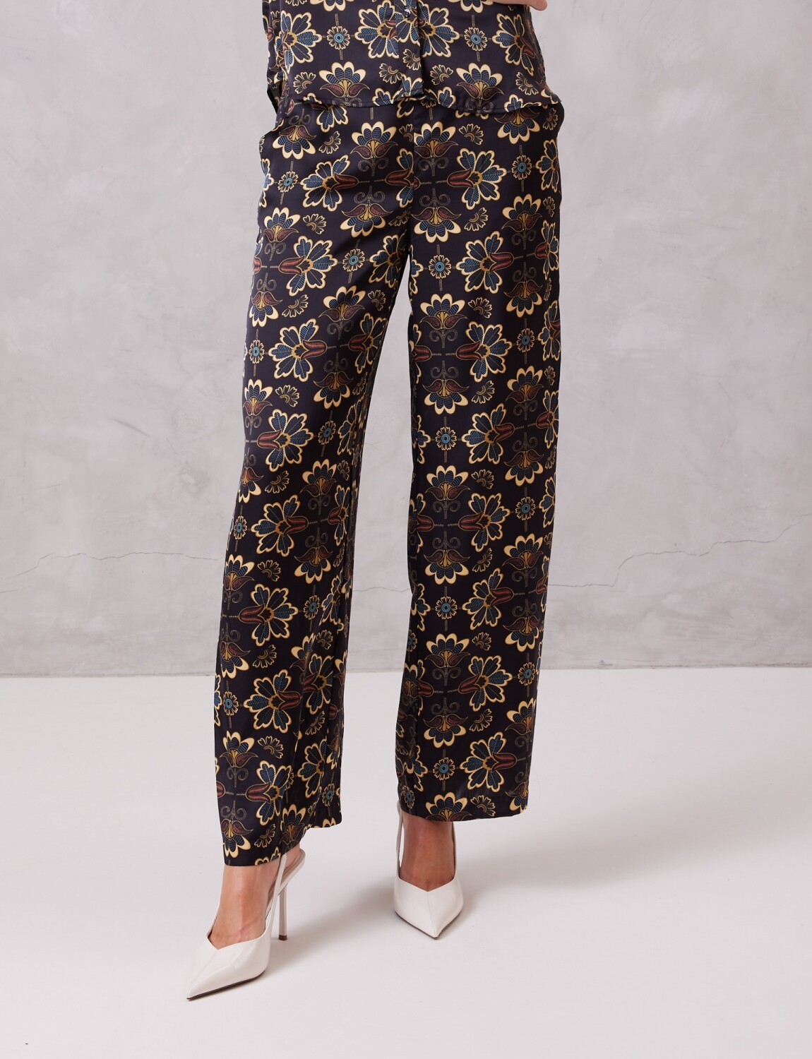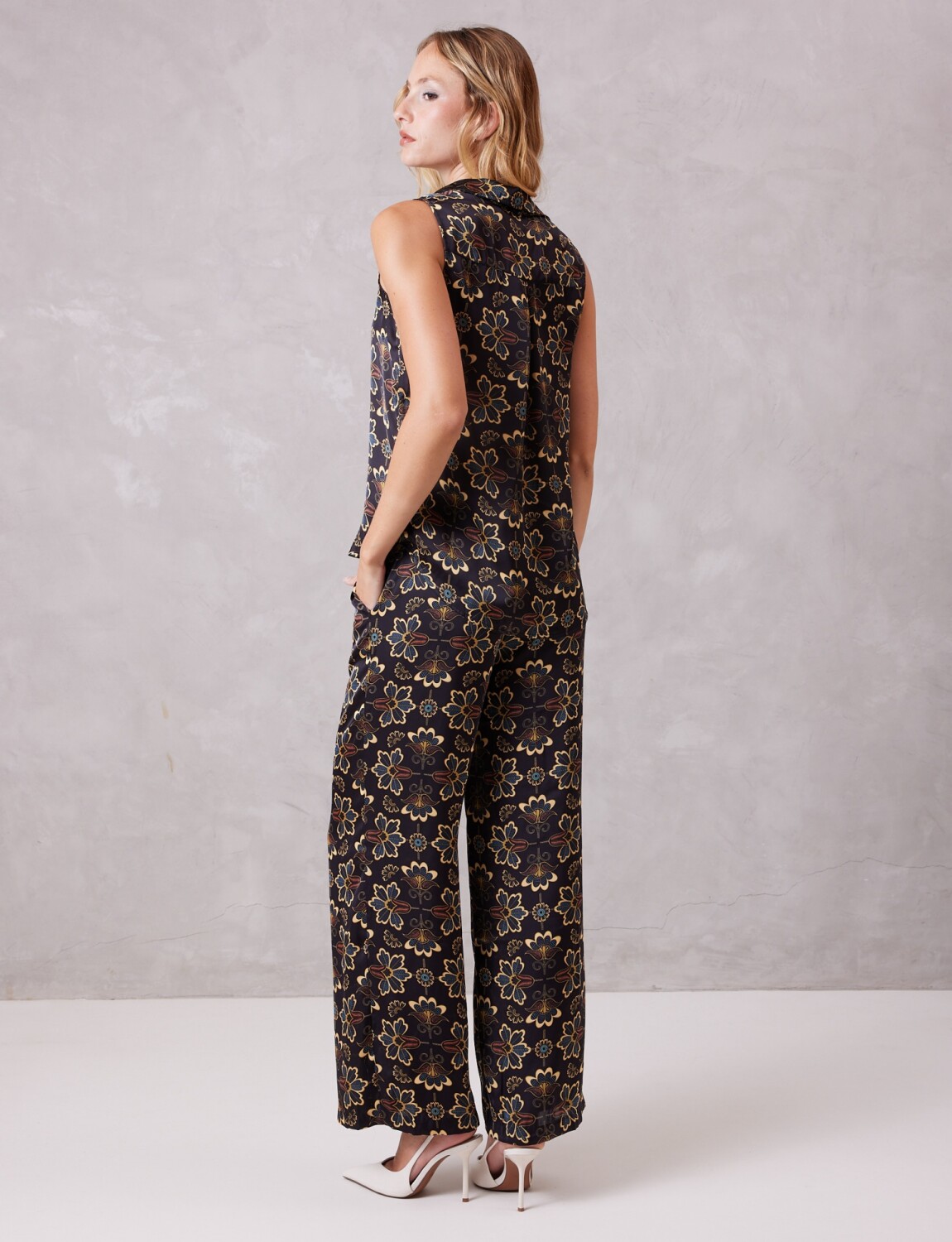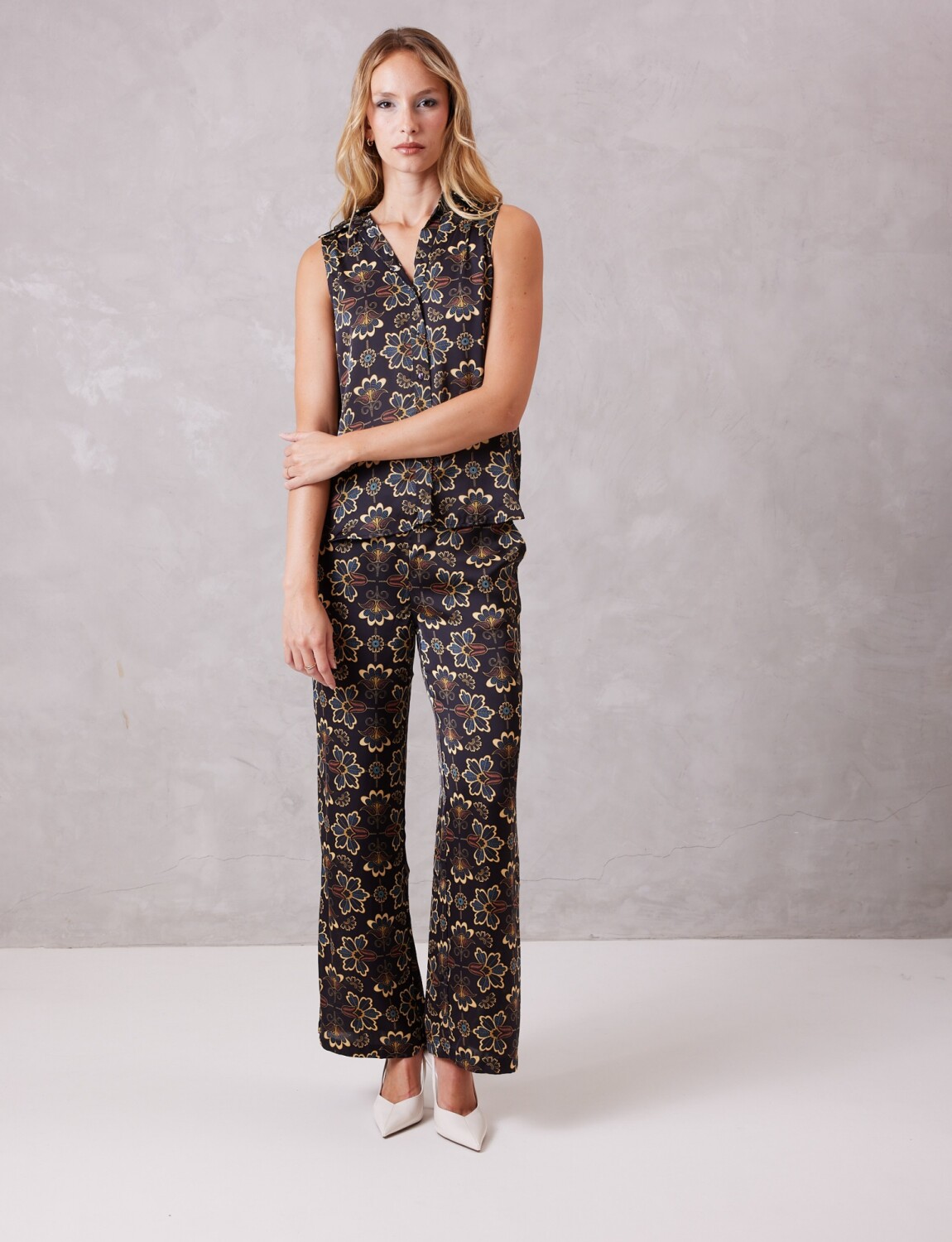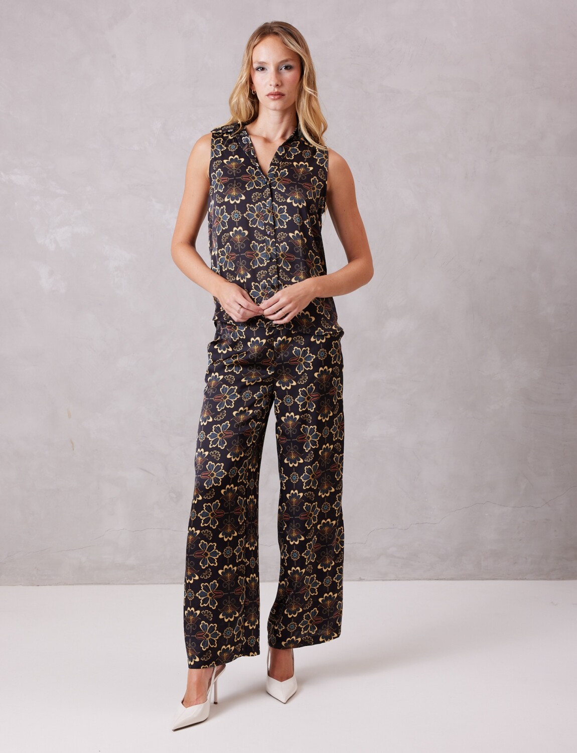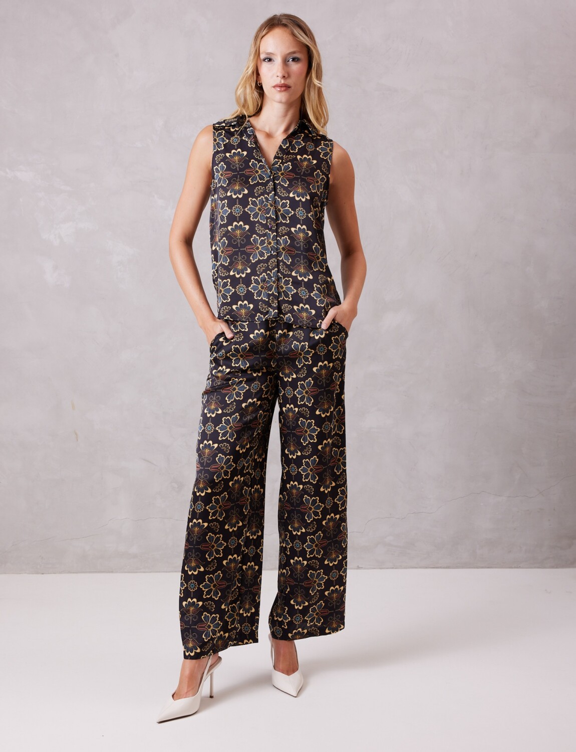 Conjunto de blusa & pantalón en satén estampado, marca Tahari.