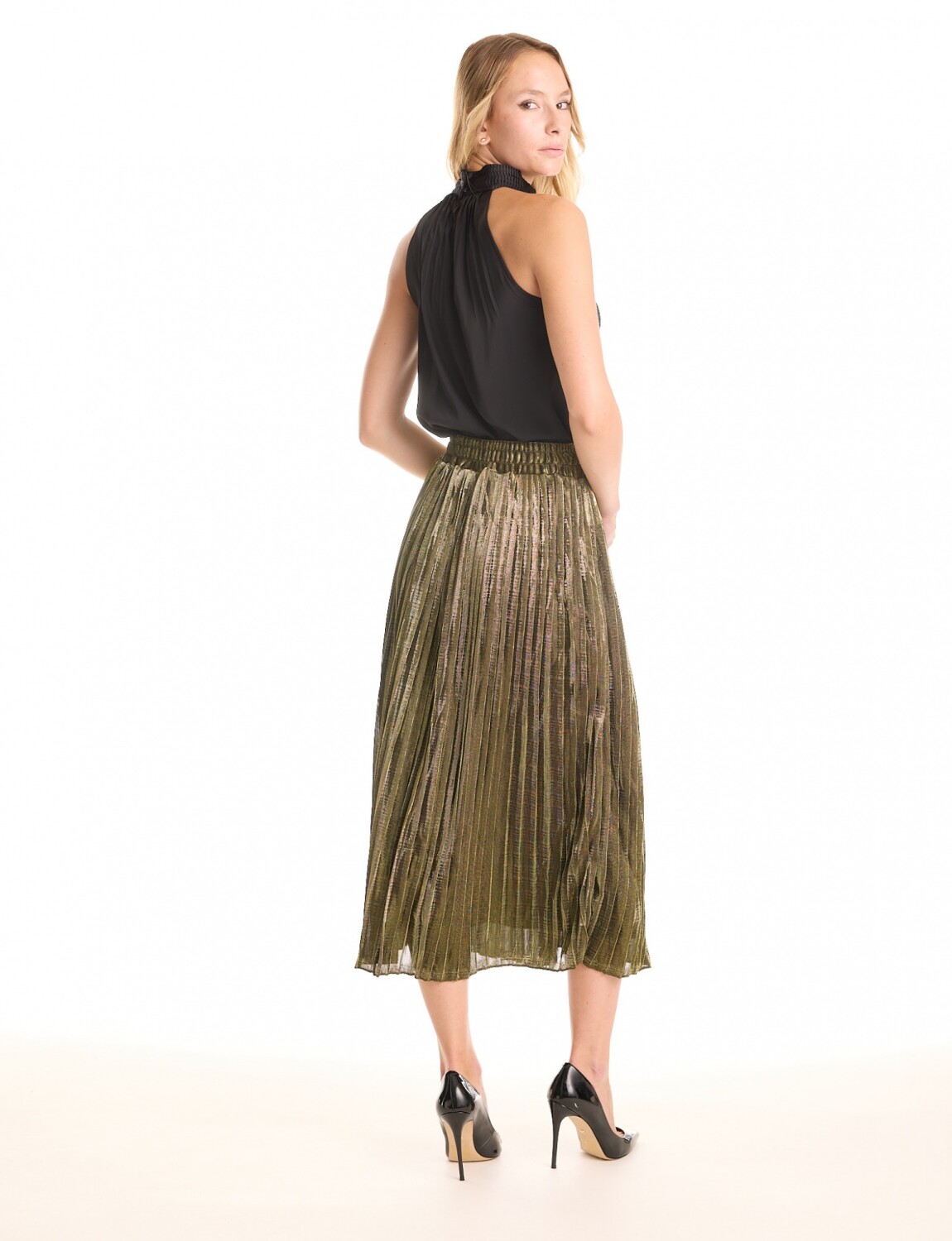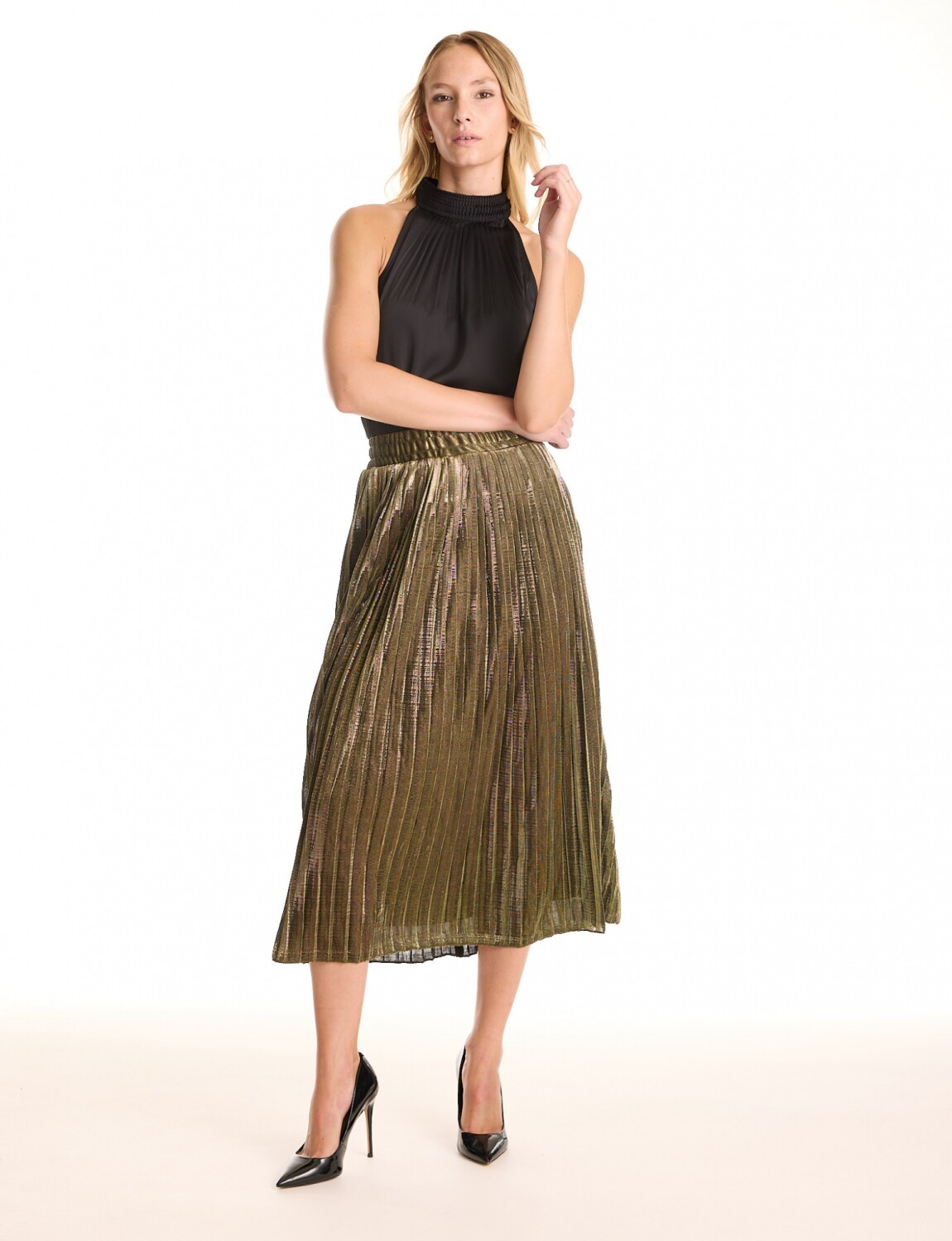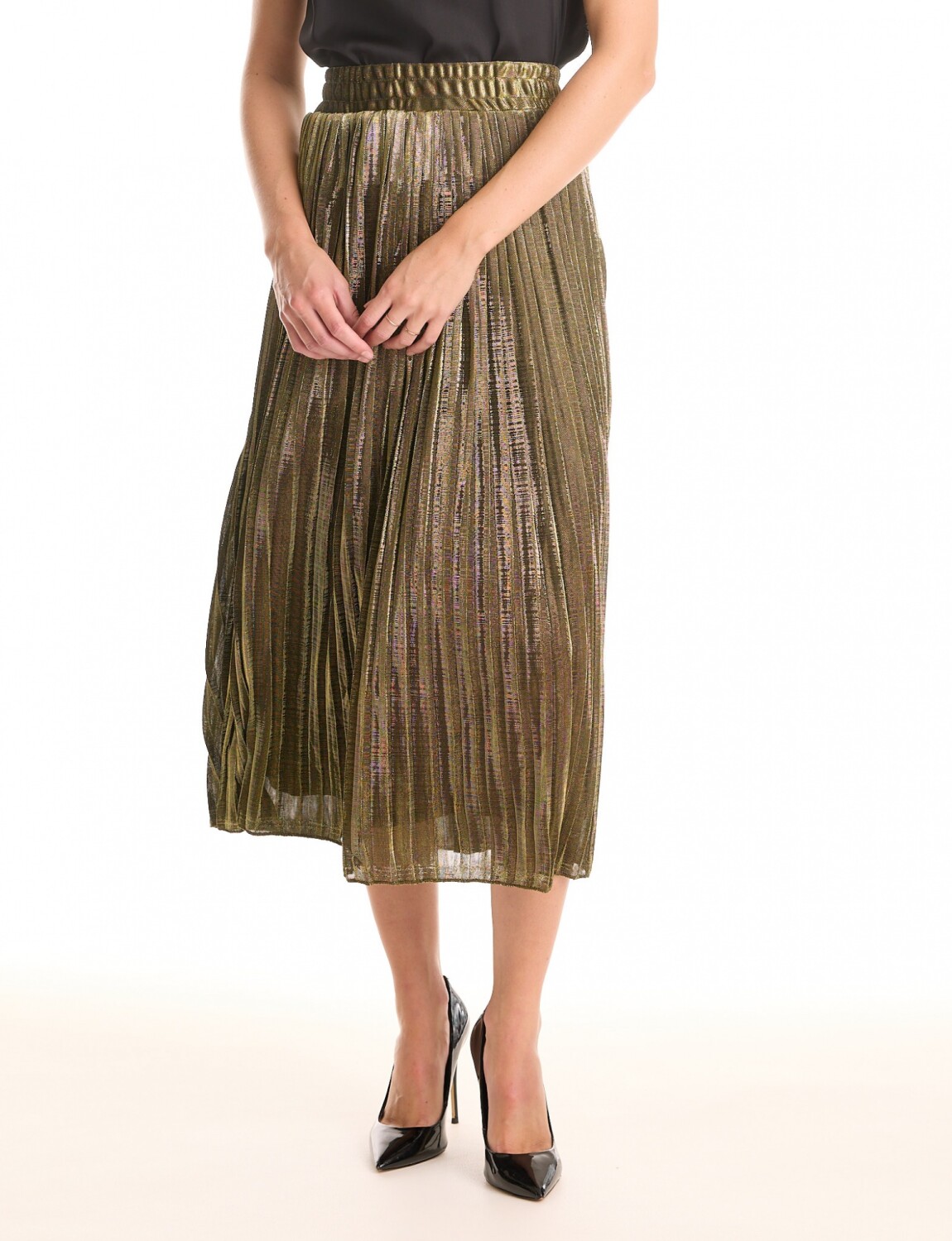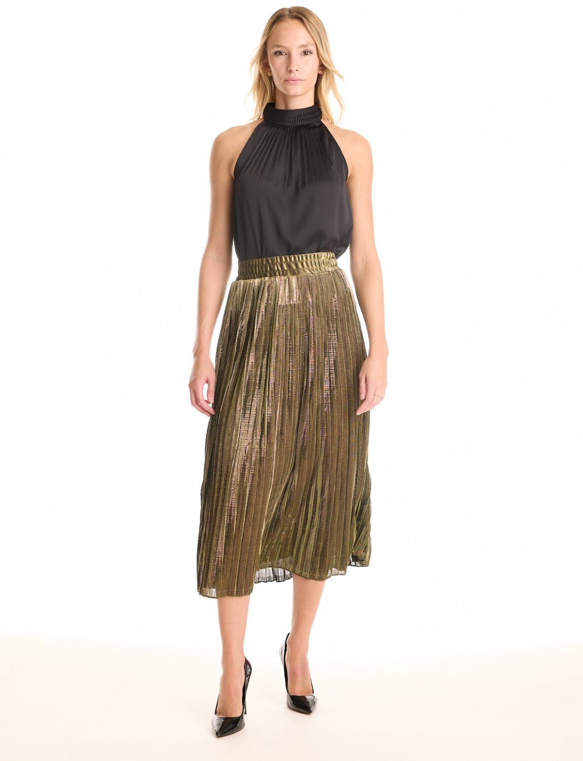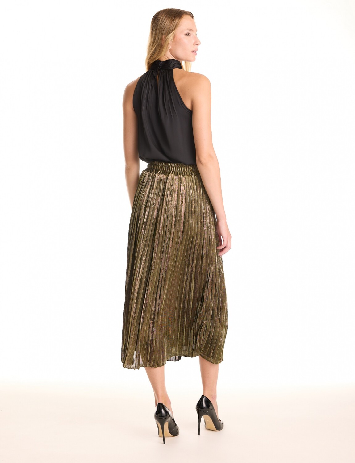Tejido con brillo metalizado, creando un efecto tornasolado entre tonos dorados y bronces.