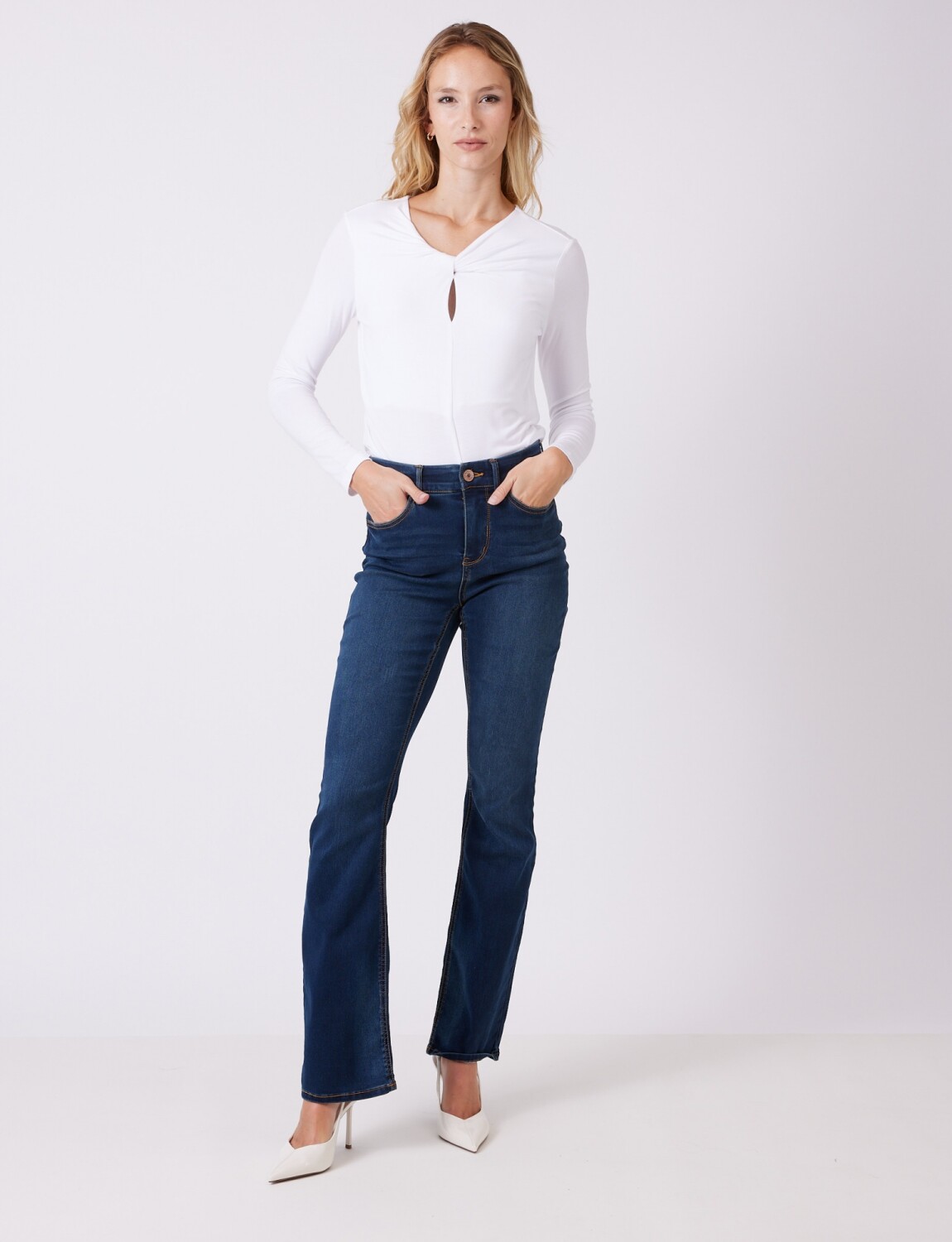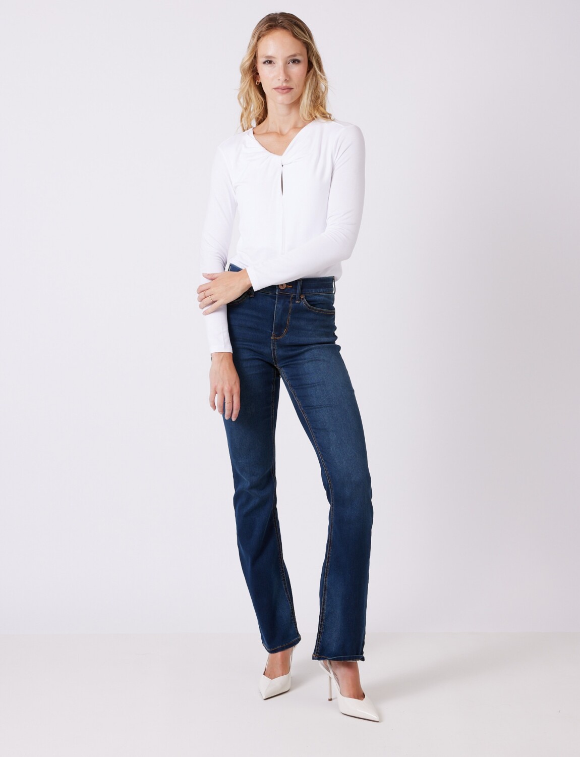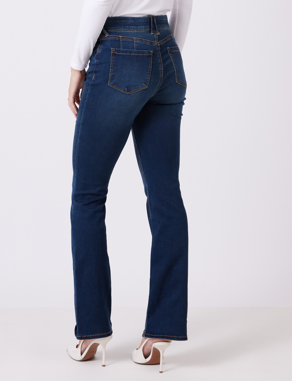 Modelo de tiro alto y pierna bootcut.