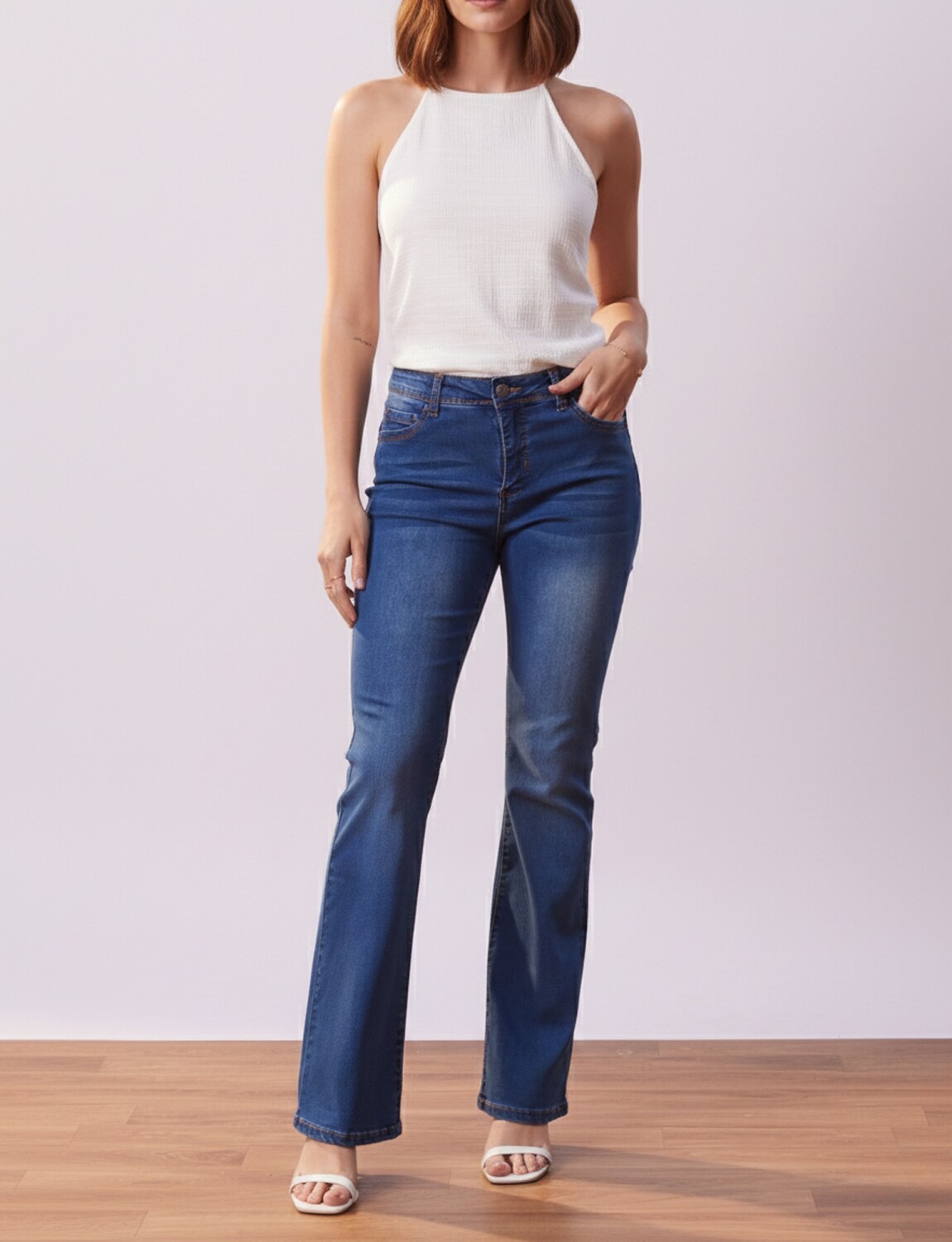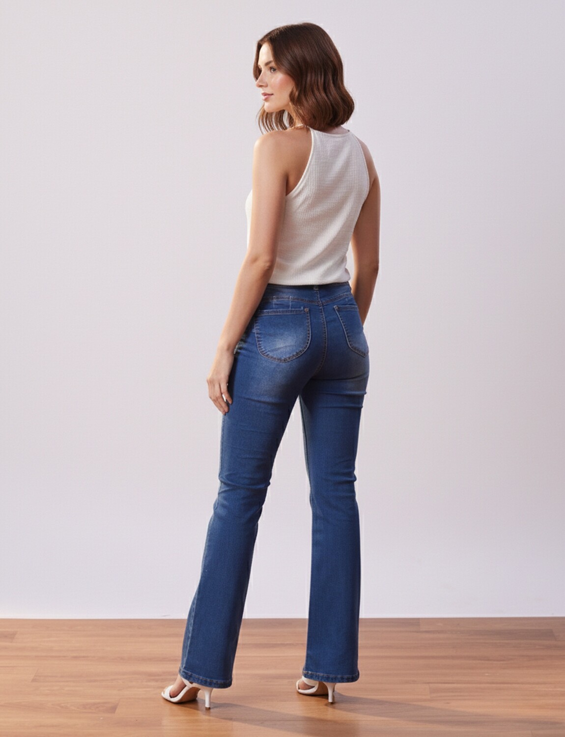 Modelo de tiro alto y terminación de pierna acampanada.