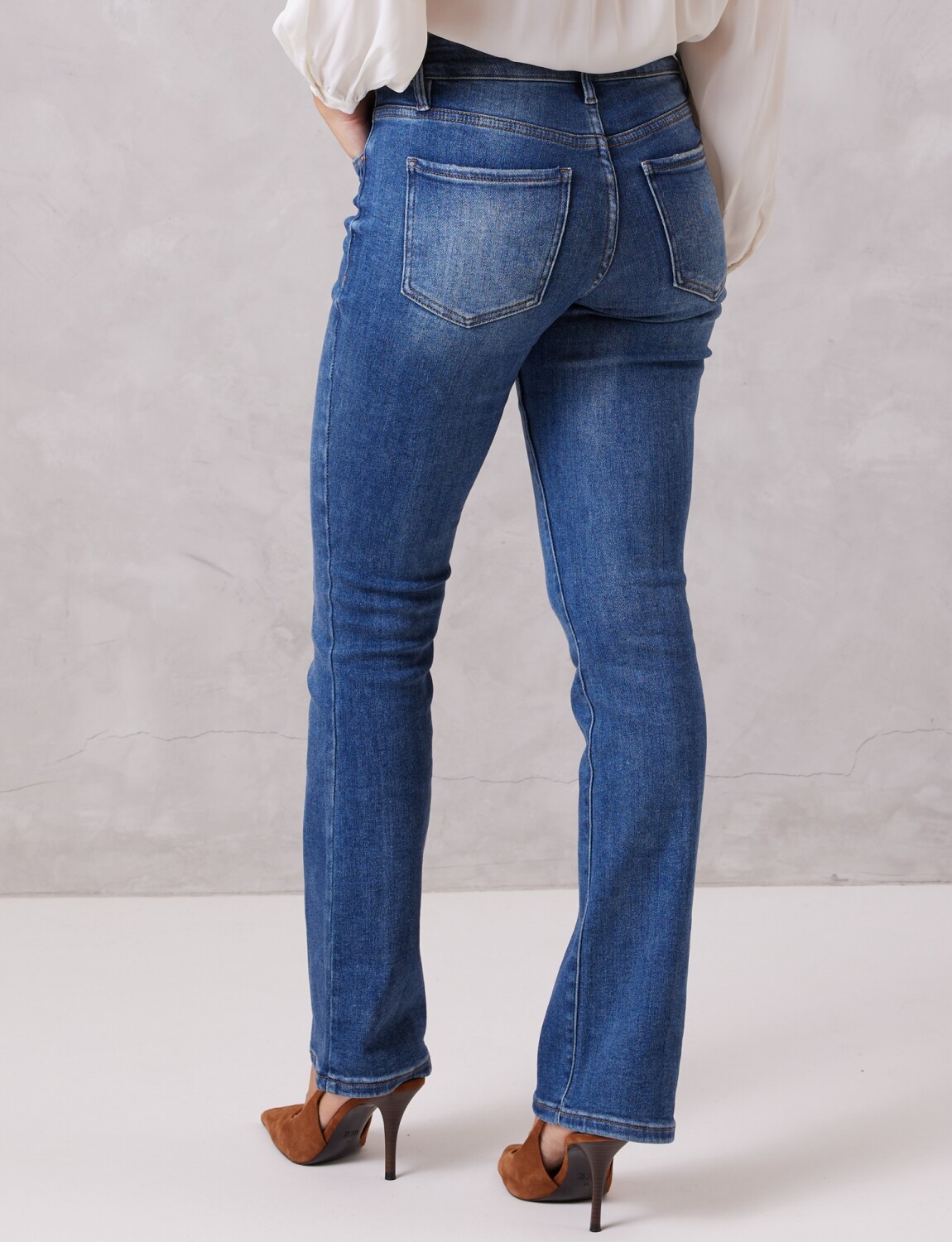 Modelo de tiro medio, pierna recta y terminacion bootcut.
