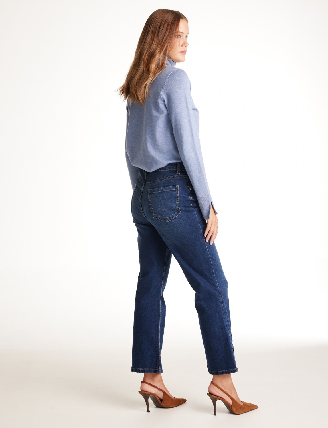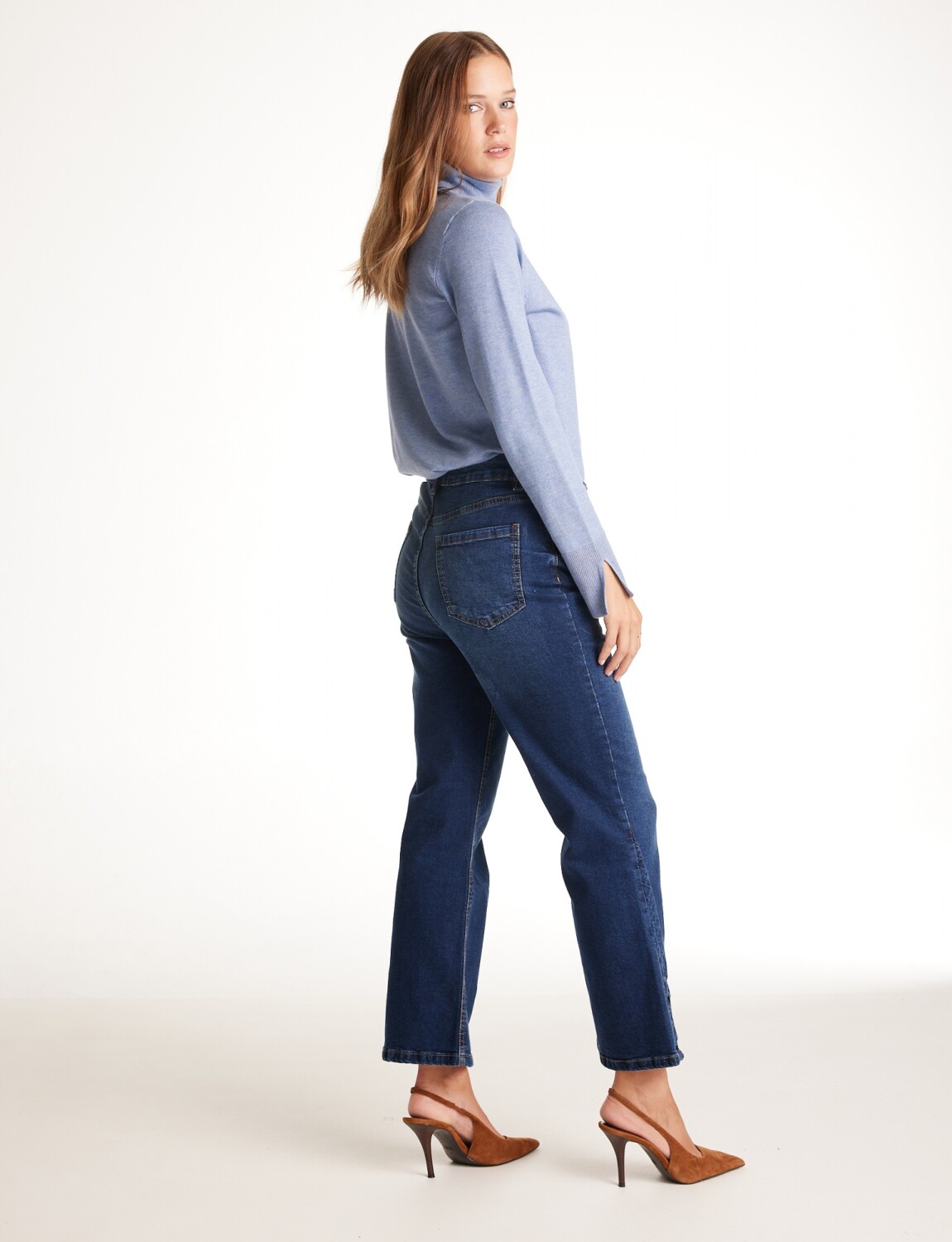 Modelo de tiro alto y terminación bootcut con tajo lateral.