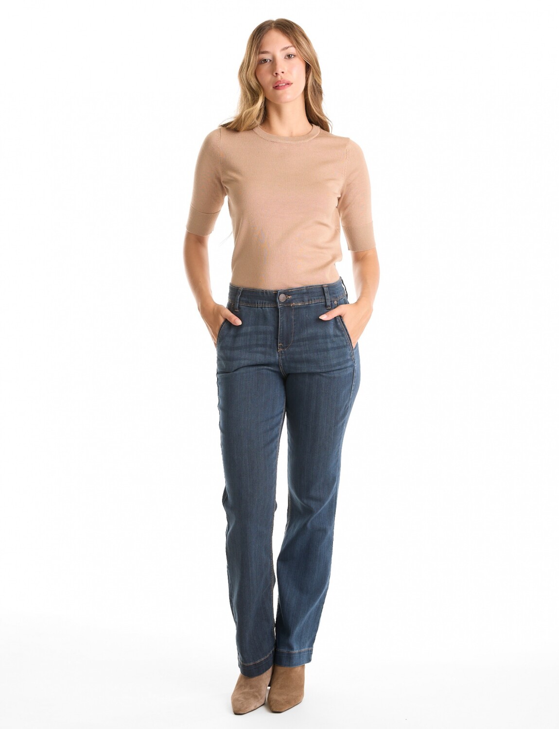 Modelo recto que mantiene un ancho constante desde la cadera hasta el bajo.