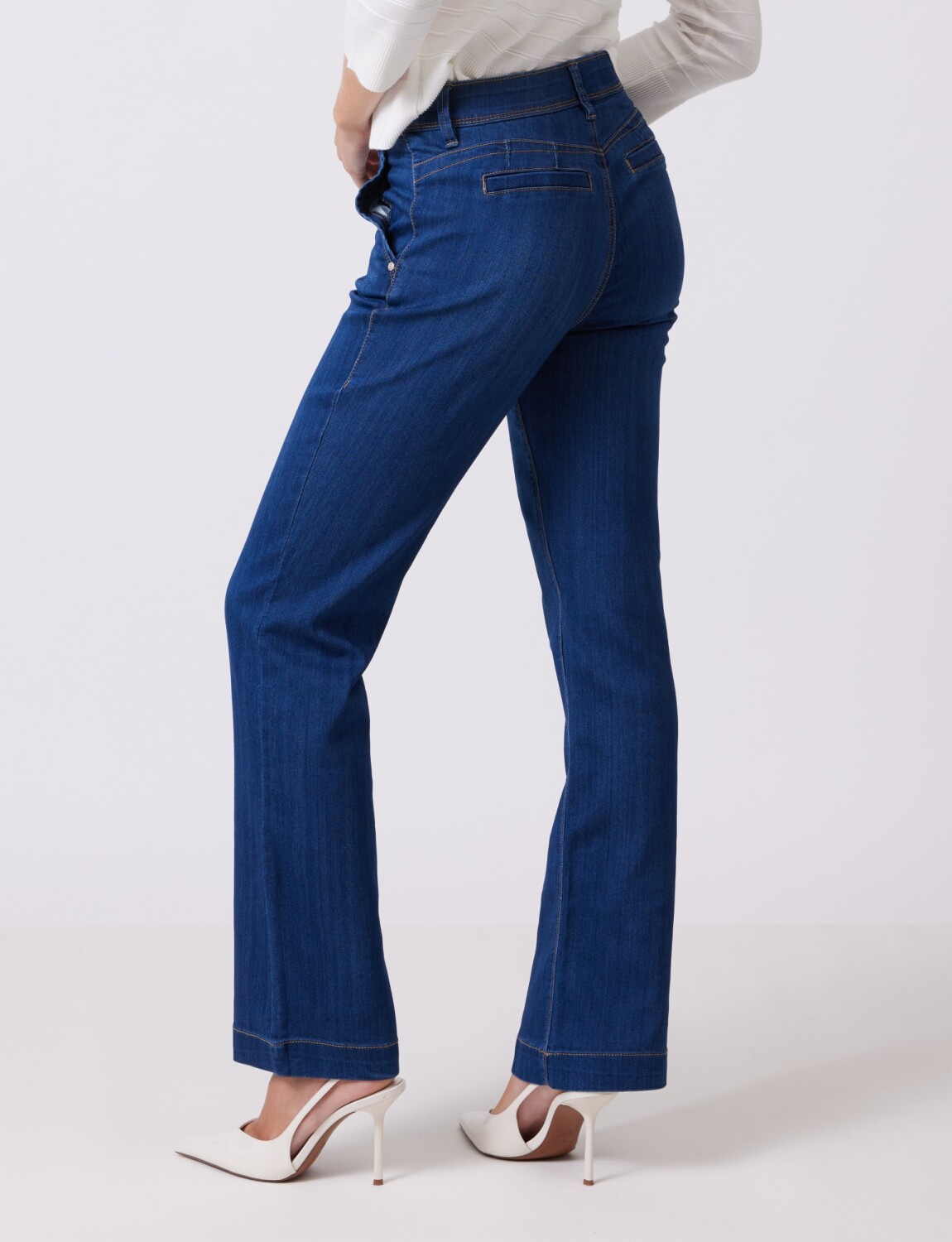 Modelo recto que mantiene un ancho constante desde la cadera hasta el bajo.