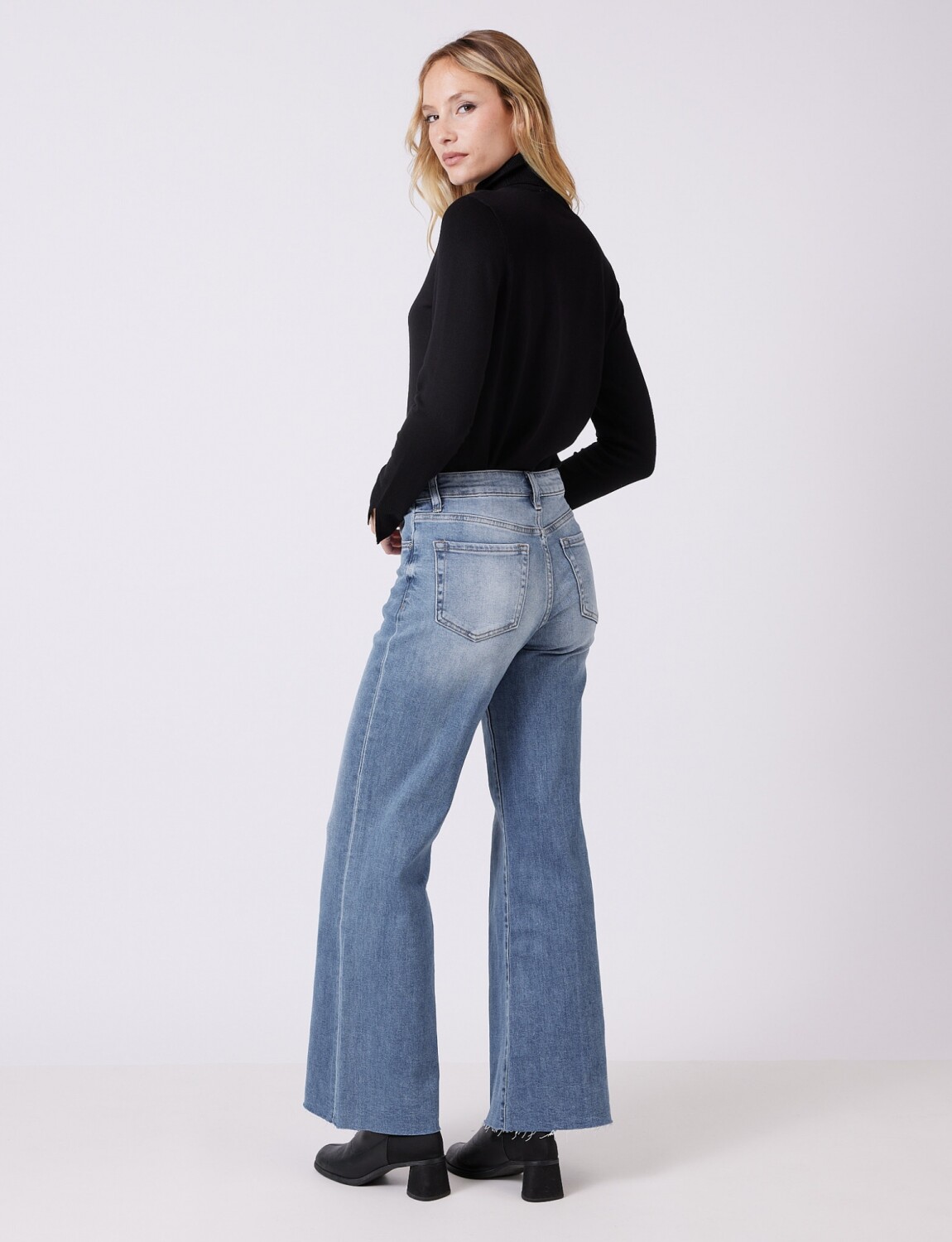 Pierna ancha desde la cadera hasta el ruedo, ofreciendo comodidad absoluta y un movimiento fluido al caminar.
