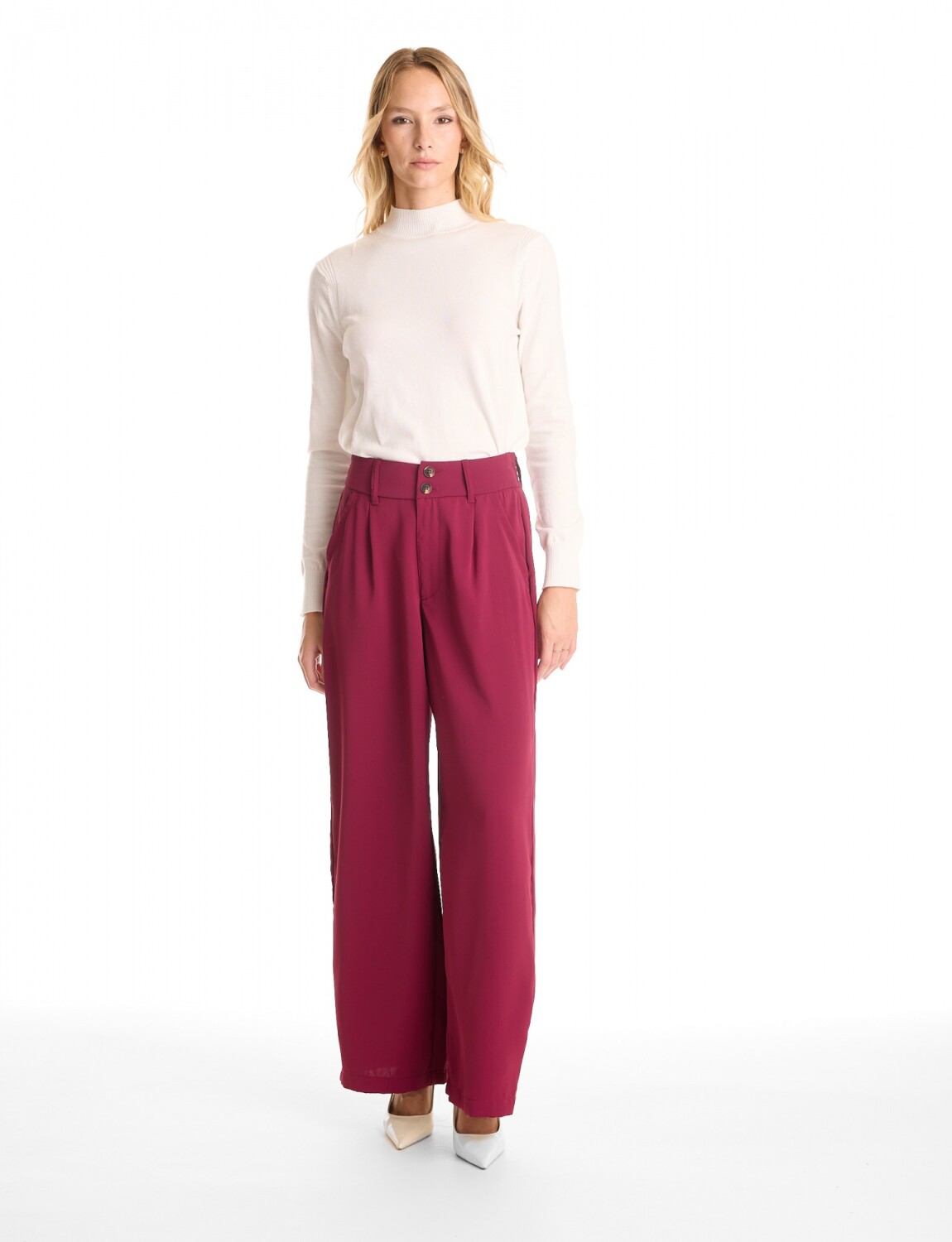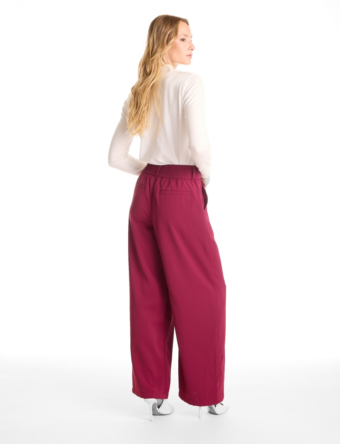 Este pantalón de corte Palazzo destaca por su silueta de pierna ancha y caída fluida, confeccionado en un tejido sastrero ligero que garantiza movimiento y una presencia impecable.